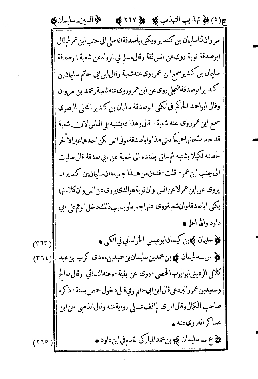 373- "س – سليمان" بن محمد بن سليمان بن حميد بن معدي كرب بن عبد كلال الرعيني أبو أيوب الحمصي روى عن بقية وعنه النسائي وقال صالح وسعيد بن عمرو والبردعي قال ابن أبي حاتم توفي قبل دخول حمص بسنة ذكره صاحب الكمال وقال المزي لم أقف على رواية عنه وقال الذهبي عن ابن عساكر أنه روى عنه.