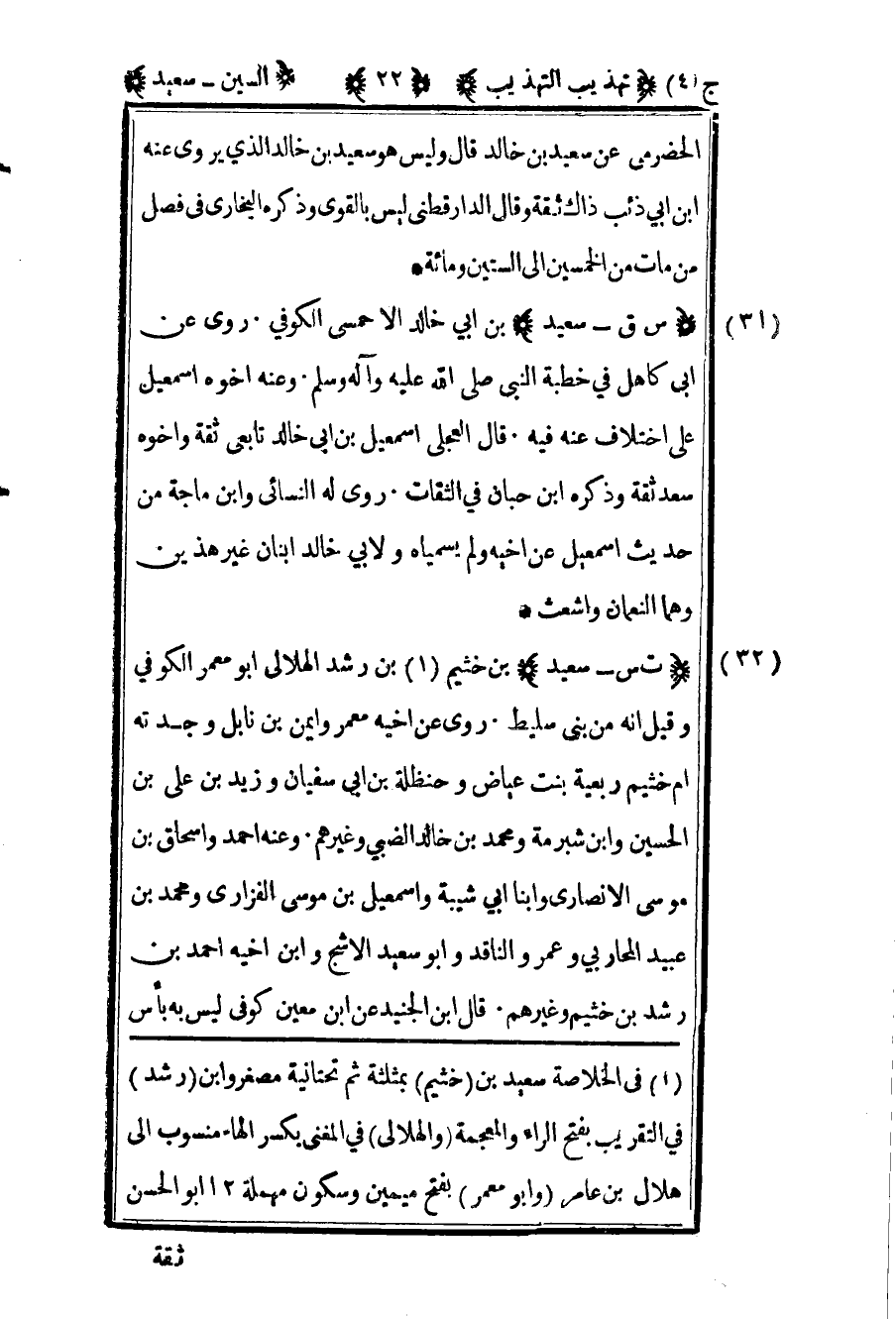 32- "ت س- سعيد" بن خثيم1 بن رشد الهلالي أبو معمر الكوفي وقيل أنه من بني سليط روى عن أخيه معمر وأيمن بن نابل وجدته أم خثيم ربعية بنت عياض وحنظلة بن أبي سفيان وزيد بن علي بن الحسين وابن شبرمة ومحمد بن خالد الضبي وغيرهم وعنه أحمد وإسحاق بن موسى الأنصاري وابنا أبي شيبة وإسماعيل بن موسى الفزاري ومحمد بن عبيد المحاربي وعمرو الناقد وأبو سعيد الأشج وابن أخيه أحمد بن رشد بن خثيم وغيرهم قال ابن الجنيد عن ابن معين كوفي ليس به بأس
