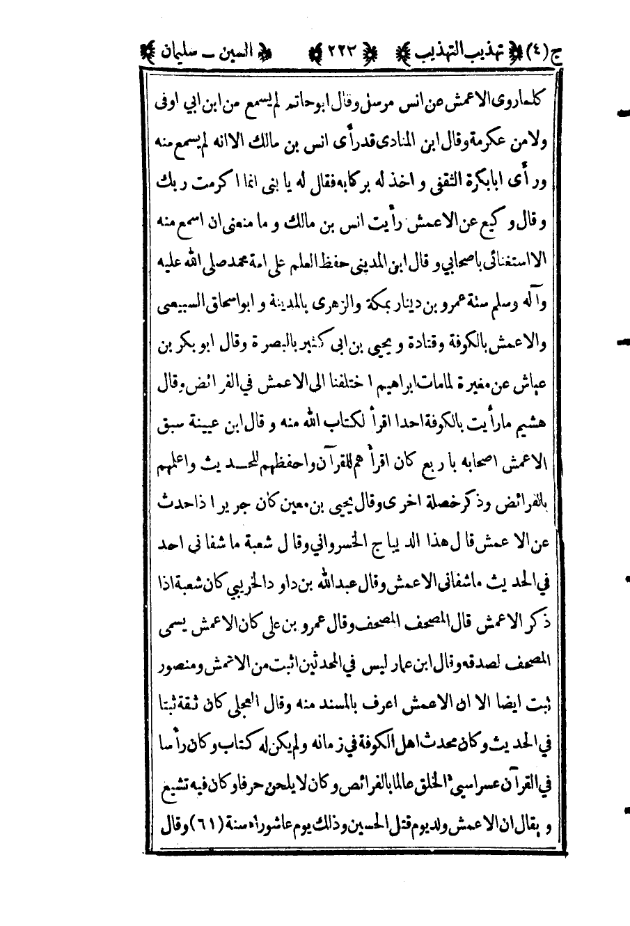 كلما روى الأعمش عن أنس مرسل وقال أبو حاتم لم يسمع من بن أبي أوفى ولا من عكرمة وقال ابن المنادى قد رأى أنس بن مالك إلا أنه لم يسمع منه ورأى أبا بكرة الثقفي وأخذ له بركابه فقال له يا بني إنما اكرمت ربك وقال وكيع عن الأعمش رأيت أنس بن مالك وما منعني أن أسمع منه إلا استغنائي بأصحابي وقال ابن المديني حفظ العلم على أمة محمد صلى الله عليه وآله وسلم ستة عمرو بن دينار بمكة والزهري بالمدينة وأبو إسحاق السبيعي والأعمش بالكوفة وقتادة ويحيى بن أبي كثير بالبصرة وقال أبو بكر بن عياش عن مغيرة لما مات إبراهيم اختلفنا إلى الأعمش في الفرائض وقال هشيم ما رأيت بالكوفة أحد اقرأ لكتاب الله منه وقال ابن عيينة سبق الأعمش أصحابه بأربع كان أقرؤهم للقرآن وأحفظهم للحديث وأعلمهم بالفرائض وذكر خصلة أخرى وقال يحيى بن معين كان جرير إذا حدث عن الأعمش قال هذا الديباج الخسرواني وقال شعبة ما شفاني أحد في الحديث ما شفاني الأعمش وقال عبد الله بن داود الخريبي كان شعبة إذا ذكر الأعمش قال المصحف المصحف وقال عمرو بن علي كان الأعمش يسمى المصحف لصدقه وقال ابن عمار ليس في المحدثين أثبت من الأعمش ومنصور ثبت أيضا إلا أن الأعمش أعرف بالمسند منه وقال العجلي كان ثقة ثبتا في الحديث وكان محدث أهل الكوفة في زمانه ولم يكن له كتاب وكان رأسا في القرآن عسرا سيء الخلق عالما بالفرائض وكان لا يلحن حرفا وكان فيه تشيع ويقال إن الأعمش ولد يوم قتل الحسين وذلك يوم عاشوراء سنة "61" وقال