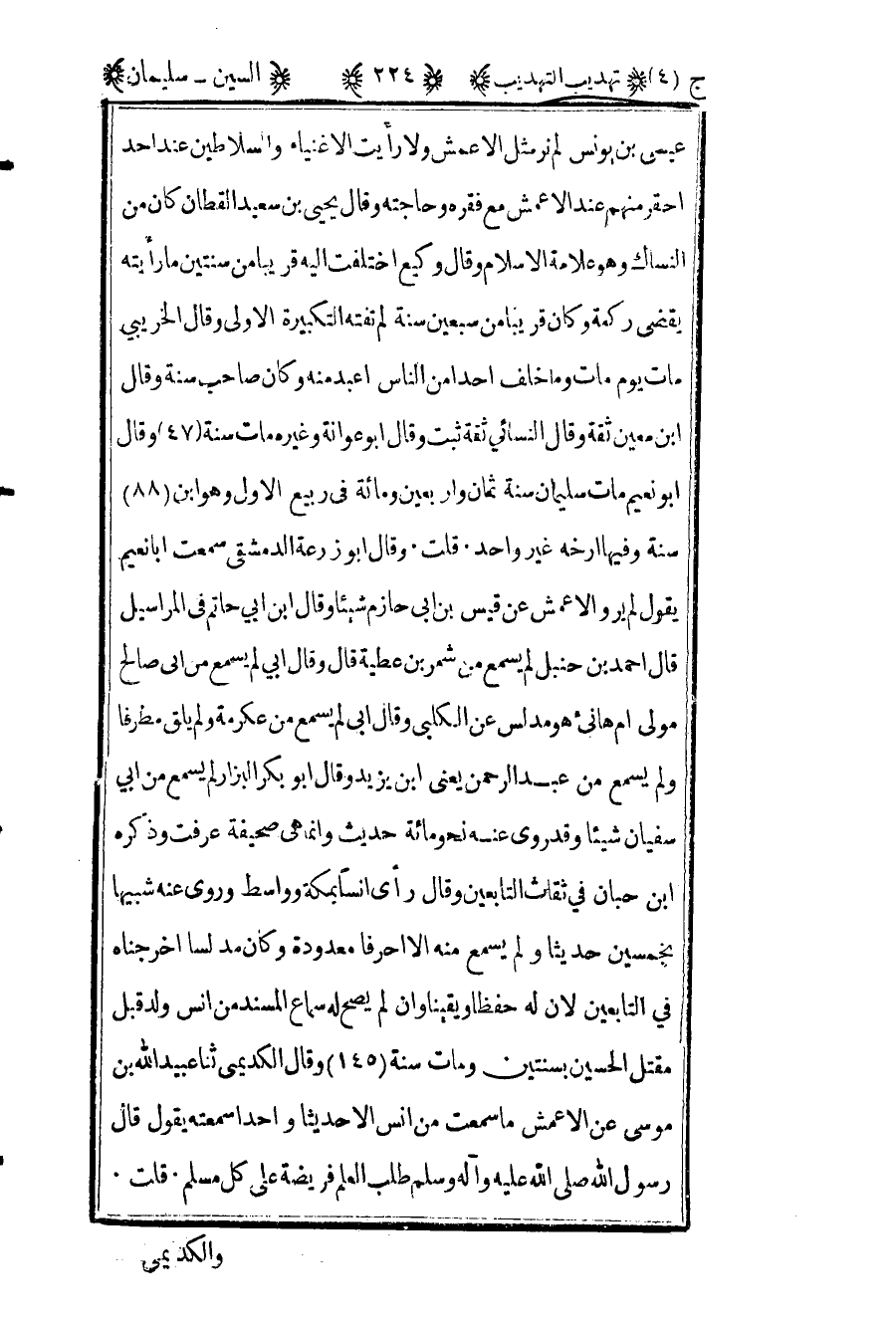 عيسى بن يونس لم نر مثل الأعمش ولا رأيت الأغنياء والسلاطين عند أحد أحقر منهم عند الأعمش مع فقره وحاجته وقال يحيى بن سعيد القطان كان من النساك وهو علامة الإسلام وقال وكيع اختلفت إليه قريبا من سنتين ما رأيته يقضي ركعة وكان قريبا من سبعين سنة لم تفته التكبيرة الأولى وقال الخريبي مات يوم مات وما خلف أحد من الناس أعبد منه وكان صاحب سنة وقال ابن معين ثقة وقال النسائي ثقة ثبت وقال أبو عوانة وغيره مات سنة 47 وقال أبو نعيم مات سليمان سنة ثمان وأربعين ومائة في ربيع الأول وهو بن 88 سنة وفيها أرخه غير واحد قلت وقال أبو زرعة الدمشقي سمعت أبا نعيم يقول لم يرو الأعمش عن عيسى بن أبي حازم شيئا وقال ابن أبي حاتم في المراسيل قال أحمد بن حنبل لم يسمع من شمر بن عطية قال وقال أبي لم يسمع من أبي صالح مولى أم هانئ هو مدلس عن الكلبي وقال أبي لم يسمع من عكرمة ولم يلق مطرفا ولم يسمع من عبد الرحمن يعني بن يزيد وقال أبو بكر البزار لم يسمع من أبي سفيان شيئا وقد روى عنه نحو مائة حديث وإنما هي صحيفة عرفت وذكره ابن حبان في ثقات التابعين وقال رأى أنسا بمكة وواسط وروى عنه شبيها بخمسين حديثا ولم يسمع منه الا احرفا معدودة وكان مدلسا اخرجناه في التابعين لأن له حفظا ويقينا وأن لم يصح له سماع المسند من أنس ولد قبل مقتل الحسين بسنتين ومات سنة 145 وقال الكديمي ثنا عبيد الله بن موسى عن الأعمش ما سمعت من أنس إلا حديثا واحدا سمعته يقول قال رسول الله صلى الله عليه وآله وسلم "طلب العلم فريضة على كل مسلم" قلت