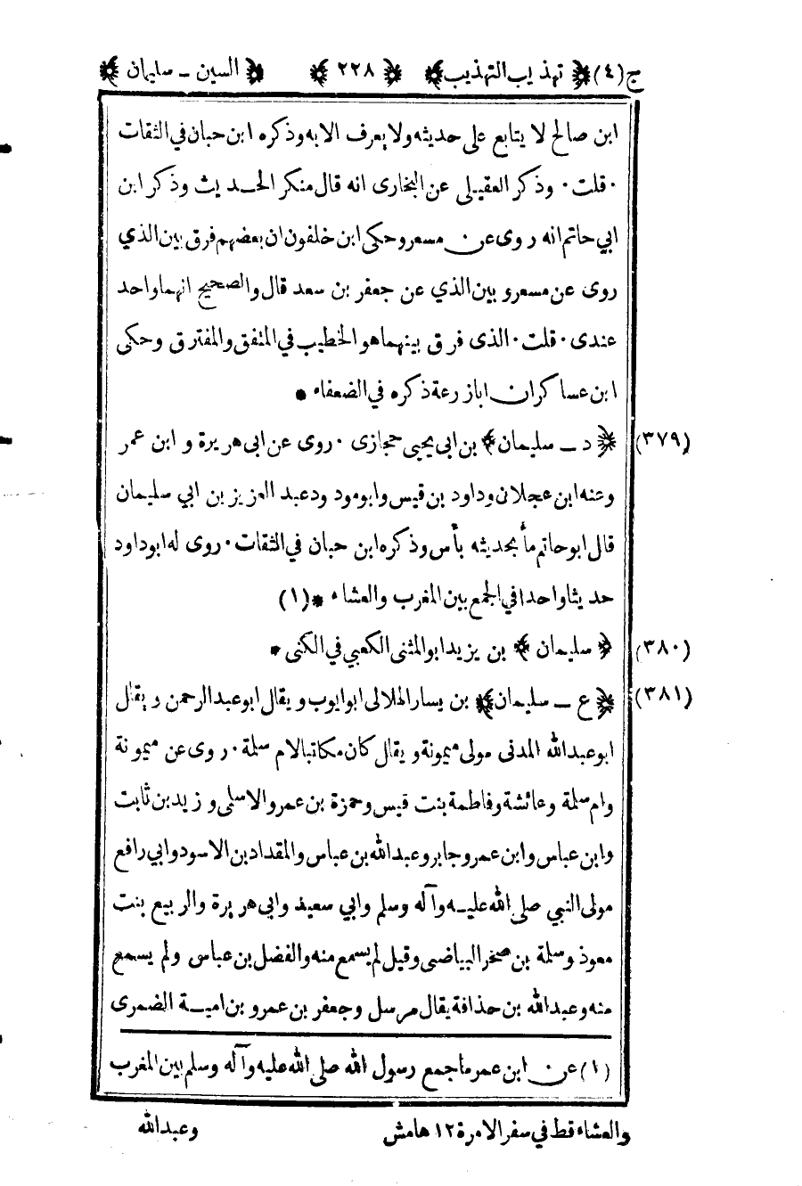 1 عن ابن عمر: ما جمع رسول الله صلى الله عليه وآله وسلم بين المغرب والعشاء قط في سفرة إلا مرة 12 هامش.