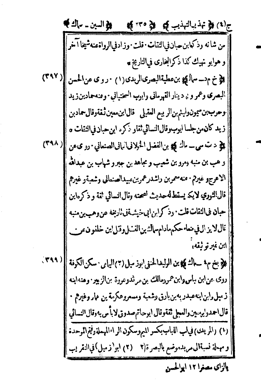 409- "بخ م 4 – سماك" بن الوليد الحنفي أبو زميل2 اليمامي سكن الكوفة روى عن ابن عباس وابن عمر ومالك بن مرثد وعروة بن الزبير وعنه ابنه زميل وابن ابنه عبد ربه بن بارق وشعبة ومسعر وعكرمة بن عمار وغيرهم قال أحمد وابن معين والعجلي ثقة وقال أبو حاتم صدوق لا بأس به وقال النسائي