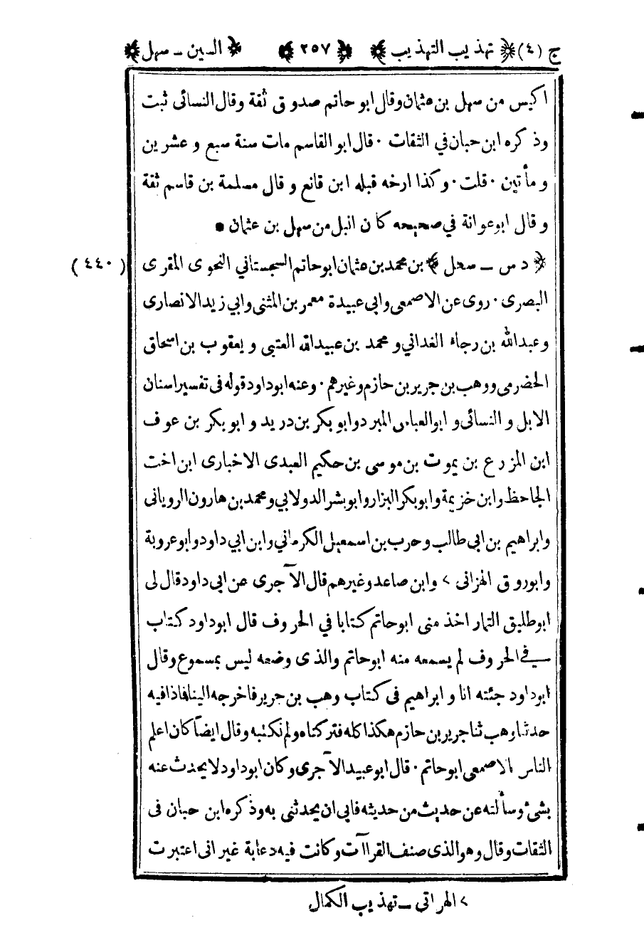 451- "د س – سهل" بن محمد بن عثمان أبو حاتم السجستاني النحوي المقري البصري روى عن الأصمعي وأبي عبيدة معمر بن المثنى وأبي زيد الأنصاري وعبد الله بن رجاء الغداني ومحمد بن عبيد الله العتبي ويعقوب بن إسحاق الحضرمي ووهب بن جرير بن حازم وغيرهم وعنه أبو داود قوله في تفسير أسنان الإبل والنسائي وأبو العباس المبرد وأبو بكر بن دريد وأبو بكر بن عوف بن المزرع بن يموت بن موسى بن حكيم العبدي الأخباري بن أخت الجاحظ وابن خزيمة وأبو بكر البزار وأبو بشر الدولابي ومحمد بن هارون الروياني وإبراهيم بن أبي طالب وحرب بن إسماعيل الكرماني وابن أبي داود وأبو عروبة وأبو روق الهزاني وابن صاعد وغيرهم قال الآجري عن أبي داود قال لي أبو طليق التمار أخذ مني أبو حاتم كتابا في الحروف قال أبو داود كتاب في الحروف لم يسمعه منه أبو حاتم والذي وضعه ليس بمسموع وقال أبو داود جئته أنا وإبراهيم في كتاب وهب بن جرير فأخرجه إلينا فإذا فيه حدثنا وهب ثنا جرير بن حازم هكذا كله فتركناه ولم نكتبه وقال أيضا كان أعلم الناس بالأصمعي أبو حاتم قال أبو عبيد الآجري وكان أبو داود لا يحدث عنه بشيء وسألته عن حديث من حديثه فأبى أن يحدثني به وذكره ابن حبان في الثقات وقال وهو الذي صنف القراءات وكانت فيه دعابة غير إني اعتبرت