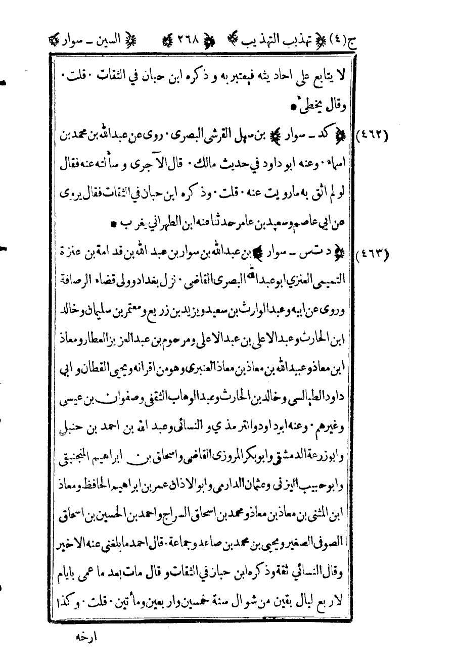474- "د ت س – سوار" بن عبد الله بن سوار بن عبد الله بن قدامة بن عنزة التميمي العنزي أبو عبد الله البصري القاضي نزل بغداد وولي قضاء الرصافة وروى عن أبيه وعبد الوارث بن سعيد ويزيد بن زريع ومعتمر بن سليمان وخالد بن الحارث وعبد الأعلى بن عبد الأعلى ومرحوم بن عبد العزيز العطار ومعاذ بن معاذ وعبيد الله بن معاذ العنبري وهو من أقرانه ويحيى القطان وأبي داود الطيالسي وخالد بن الحارث وعبد الوهاب الثقفي وصفوان بن عيسى وغيرهم وعنه أبو داود الترمذي والنسائي وعبد الله بن أحمد بن حنبل وأبو زرعة الدمشقي وأبو بكر المروزي القاضي وإسحاق بن إبراهيم المنجنيقي وأبو حبيب اليزني وعثمان الدارمي وأبو الأذان عمر بن إبراهيم الحافظ ومعاذ بن المثنى بن معاذ بن معاذ ومحمد بن إسحاق السراج وأحمد بن الحسين بن إسحاق الصوفي الصغير ويحيى بن محمد بن صاعد وجماعة قال أحمد ما بلغني عنه إلا خير وقال النسائي ثقة وذكره ابن حبان في الثقات وقال مات بعدما عمي بأيام لأربع ليال بقين من شوال سنة خمسين وأربعين ومائتين قلت وكذا