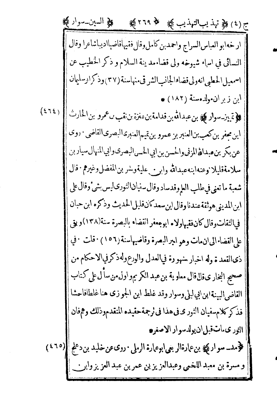 475- "تمييز- سوار" بن عبد الله بن قدامة بن عنزة بن نقب بن عمرو بن الحارث بن مجفر بن كعب بن العنبر بن عمرو بن تميم العنبري البصري القاضي روى عن بكر بن عبد الله المزني والحسن بن أبي الحسن البصري وأبي المنهال سيار بن سلامة قليلا وعنه ابنه عبد الله وابن علية وبشر بن المفضل وغيرهم قال شعبة ما تعني في طلب العلم وقد ساد وقال سفيان الثوري ليس بشيء وقال علي بن المديني هو ثقة عندنا وقال ابن سعد كان قليل الحديث وذكره ابن حبان في الثقات وقال كان فقيها ولاه أبو جعفر القضاء بالبصرة سنة "138" وبقي على القضاء إلى أن مات وهو أمير البصرة وقاضيها سنة "156" قلت في ذي القعدة وله أخبار مشهورة في العدل والورع وله ذكر في الأحكام من صحيح البخاري قال قال معاوية بن عبد الكريم وأول من سأل على كتاب القاضي البينة بن أبي ليلى وسوار وقد غلط بن الجوزي هنا غلطا فاحشا فذكر كلام سفيان الثوري في هذا في ترجمة حفيده المتقدم وذلك وهم فإن الثوري مات قبل أن يولد سوار الأصغر.