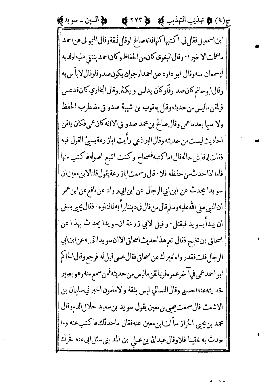 بن إسماعيل فقال لي أكتبها كلها فإنه صالح أو قال ثقة وقال الميموني عن أحمد ما علمت إلا خيرا وقال البغوي كان من الحفاظ وكان أحمد ينتقي عليه لولديه فيسمعان منه وقال أبو داود عن أحمد أرجو أن يكون صدوقا لا بأس به وقال أبو حاتم كان صدوقا وكان يدلس ويكثر وقال البخاري كان قد عمي فيلقن ما ليس من حديثه وقال يعقوب بن شيبة صدوق مضطرب الحفظ ولا سيما بعدما عمي وقال صالح بن محمد صدوق إلا أنه كان عمي فكان يلقن أحاديث ليس من حديثه وقال البرذعي رأيت أبا زرعة يسيىء القول فيه فقلت له فايش حاله قال أما كتبه فصحاح وكنت أتتبع أصوله فاكتب منها فأما إذا حدث من حفظه فلا قال وسمعت أبا زرعة يقول قلنا لابن معين أن سويدا يحدث عن ابن أبي الرجال عن ابن أبي رواد عن نافع عن ابن عمر أن النبي صلى الله عليه وسلم قال: "من قال في ديننا برأيه فاقتلوة" فقال يحيى ينبغي أن يبدأ بسويد فيقتل وقيل لأبي زرعة أن سويدا يحدث بهذا عن إسحاق بن نجيح فقال نعم هذا حدث إسحاق إلا أن سويدا أتى به عن ابن أبي الرجال قلت فقد رواه لغيرك عن إسحاق فقالت عسى قيل له فرجع وقال الحاكم أبو أحمد عمي في آخر عمره فربما لقن ما ليس من حديثه فمن سمع منه وهو بصير فحديثه عنه حسن وقال النسائي ليس بثقة ولا مأمون أخبرني سليمان بن الأشعث قال سمعت يحيى بن معين يقول سويد بن سعيد حلال الدم وقال محمد بن يحيى الحراز سألت بن معين عنه فقال ما حدثك فاكتب عنه وما حدث به تلقينا فلا وقال عبد الله بن علي بن المديني سئل أبي عنه فحرك