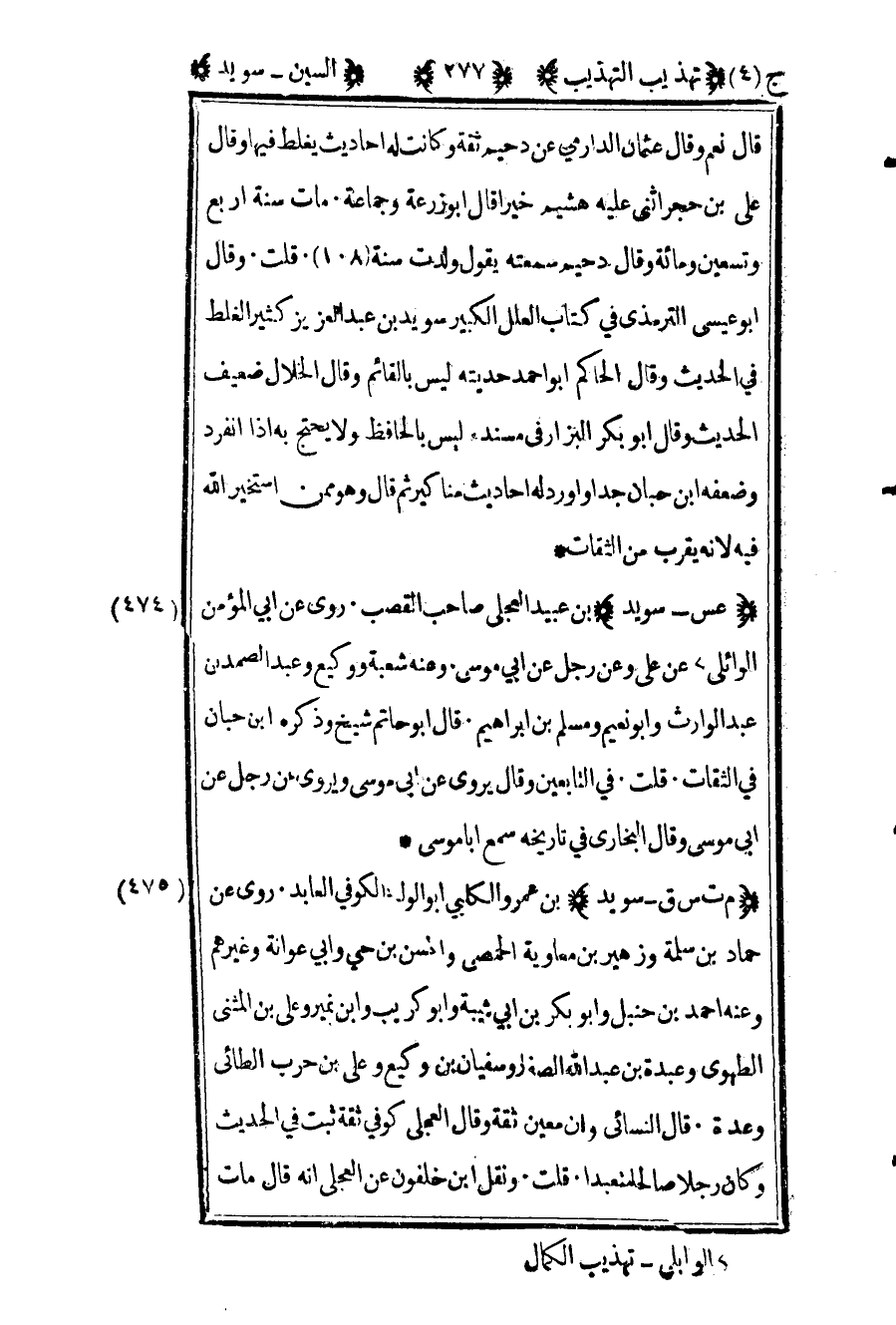 486- "م ت س ق – سويد" بن عمرو الكلبي أبو الوليد الكوفي العابد روى عن حماد بن سلمة وزهير بن معاوية الحمصي وأنس بن حي وأبي عوانة وغيرهم وعنه أحمد بن حنبل وأبو بكر بن أبي شيبة وأبو كريب وابن نمير وعلي بن المثنى الطهوي وعبدة بن عبد الله الصفار وسفيان بن وكيع وعلي بن حرب الطائي وعدة قال النسائي وابن معين ثقة وقال العجلي كوفي ثقة ثبت في الحديث وكان رجلا صالحا متعبدا قلت ونقل بن خلفون عن العجلي أنه قال مات