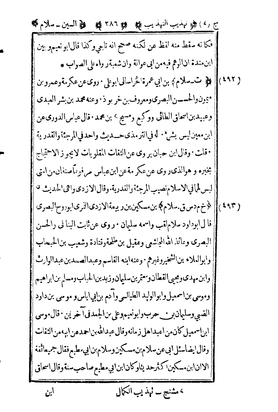 504- "خ م د س ق - سلام" بن مسكين بن ربيعة الأزدي النمري أبو روح البصري قال أبو داود سلام لقب واسمه سليمان روى عن ثابت البناني والحسن البصري وعائذ الله المجاشعي وعقيل بن طلحة وقتادة وشعيب بن الحبحاب وأبو العلاء بن الشخير وغيرهم وعنه ابنه القاسم وعبد الصمد بن عبد الوارث وابن مهدي ويحيى القطان ومعتمر بن سليمان وزيد بن الحباب ومسلم بن إبراهيم وموسى بن إسماعيل وأبو الوليد الطيالسي وآدم بن أبي إياس وموسى بن داود الضبي وسليمان بن حرب وأبو نعيم وعلي بن الجعد في آخرين قال موسى بن إسماعيل كان من أعبد أهل زمانه وقال عبد الله بن أحمد عن أبيه من الثقات وقال أيضا سئل أبي عن سلام بن مسكين وسلام بن أبي مطيع فقال جميعا ثقة إلا أن بن مسكين أكثر حديثا وكان بن أبي مطيع صاحب سنة وقال إسحاق