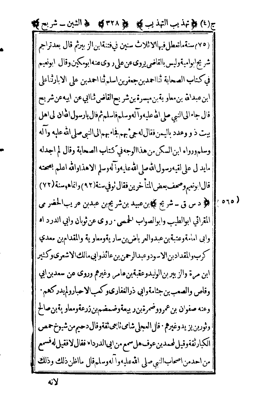 575- "د س ق – شريح" بن عبيد بن شريح بن عبد بن عريب الحضرمي المقرائي أبو الطيب وأبو الصواب الحمصي روى عن ثوبان وأبي الدرداء وأبي أمامة وعتبة بن عبد والعرباض بن سارية ومعاوية والمقدام بن معدي كرب والمقداد بن الأسود وعبد الرحمن بن عائذ وأبي مالك الأشعري وكثير بن مرة والزبير بن الوليد وعقبة بن عامر وغيرهم وروي عن سعد بن أبي وقاص والصعب بن جثامة وأبي ذر الغفاري وكعب الأحبار ولم يدركهم وعنه صفوان بن عمرو وضمرة بن ربيعة وضمضم بن زرعة ومعاوية بن صالح وثور بن يزيد وغيرهم قال العجلي شامي تابعي ثقة وقال دحيم من شيوخ حمص الكبار ثقة وقيل لمحمد بن عوف هل سمع من أبي الدرداء فقال لا فقيل له فسمع من أحد من أصحاب النبي صلى الله عليه وسلم قال ما أظن ذلك وذلك