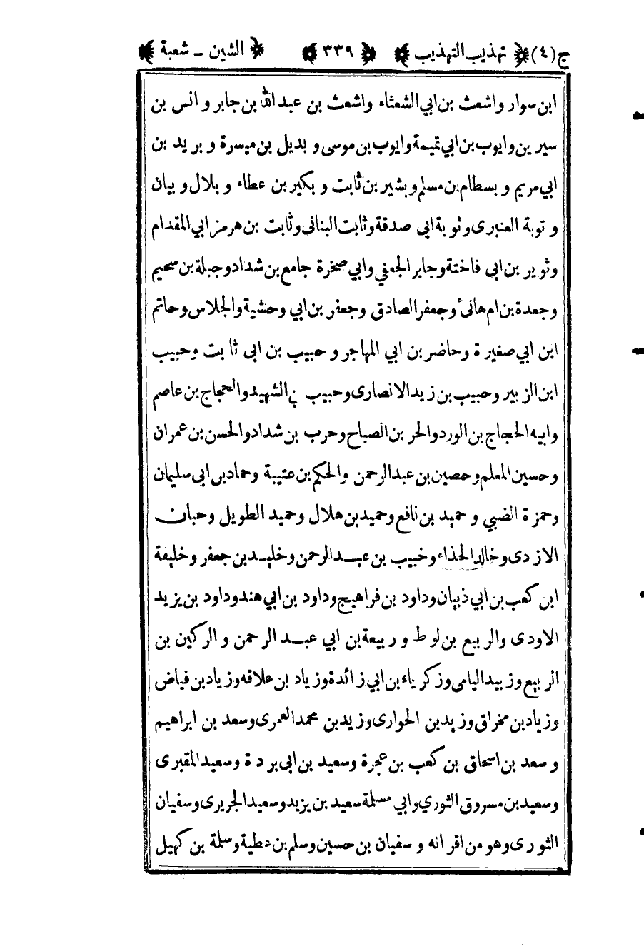 ابن سوار وأشعث بن أبي الشعثاء وأشعث بن عبد الله بن جابر وأنس بن سيرين وأيوب بن أبي تميمة وأيوب بن موسى وبديل بن ميسرة وبريد بن أبي مريم وبسطام بن مسلم وبشير بن ثابت وبكير بن عطاء وبلال وبيان وتوبة العنبري وتوبة أبي صدقة وثابت البناني وثابت بن هرمز أبي المقدام وثوير بن أبي فاختة وجابر الجعفي وأبي صخرة جامع بن شداد وجبلة بن سحيم وجعدة بن أم هانئ وجعفر الصادق وجعفر بن أبي وحشية والجلاس وحاتم بن أبي صغيرة وحاضر بن أبي المهاجر وحبيب بن أبي ثابت وحبيب ابن الزبير وحبيب بن زيد الأنصاري وحبيب بن الشهيد والحجاج بن عاصم وأبيه الحجاج بن الورد والحر بن الصباح وحرب بن شداد والحسن بن عمران وحسين المعلم وحصين بن عبد الرحمن والحكم بن عتيبة وحماد بن أبي سليمان وحمزة الضبي وحميد بن نافع وحميد بن هلال وحميد الطويل وحبان الأزدي وخالد الحذاء وخبيب بن عبد الرحمن وخليد بن جعفر وخليفة بن كعب بن أبي ذبيان وداود بن فراهيج وداود بن أبي هند وداود بن يزيد الأودي والربيع بن لوط وربيعة بن أبي عبد الرحمن والركين بن الربيع وزبيد اليامي وزكرياء بن أبي زائدة وزياد بن علاقة وزياد بن فياض وزياد بن مخراق وزيد بن الحواري وزيد بن محمد العمري وسعد بن إبراهيم وسعد بن إسحاق بن كعب بن عجرة وسعيد بن أبي بردة وسعيد المقبري وسعيد بن مسروق الثوري وأبي مسلمة سعيد بن يزيد وسعيد الجريري وسفيان الثوري وهو من أقرانه وسفيان بن حسين وسلم بن عطية وسلمة بن كهيل