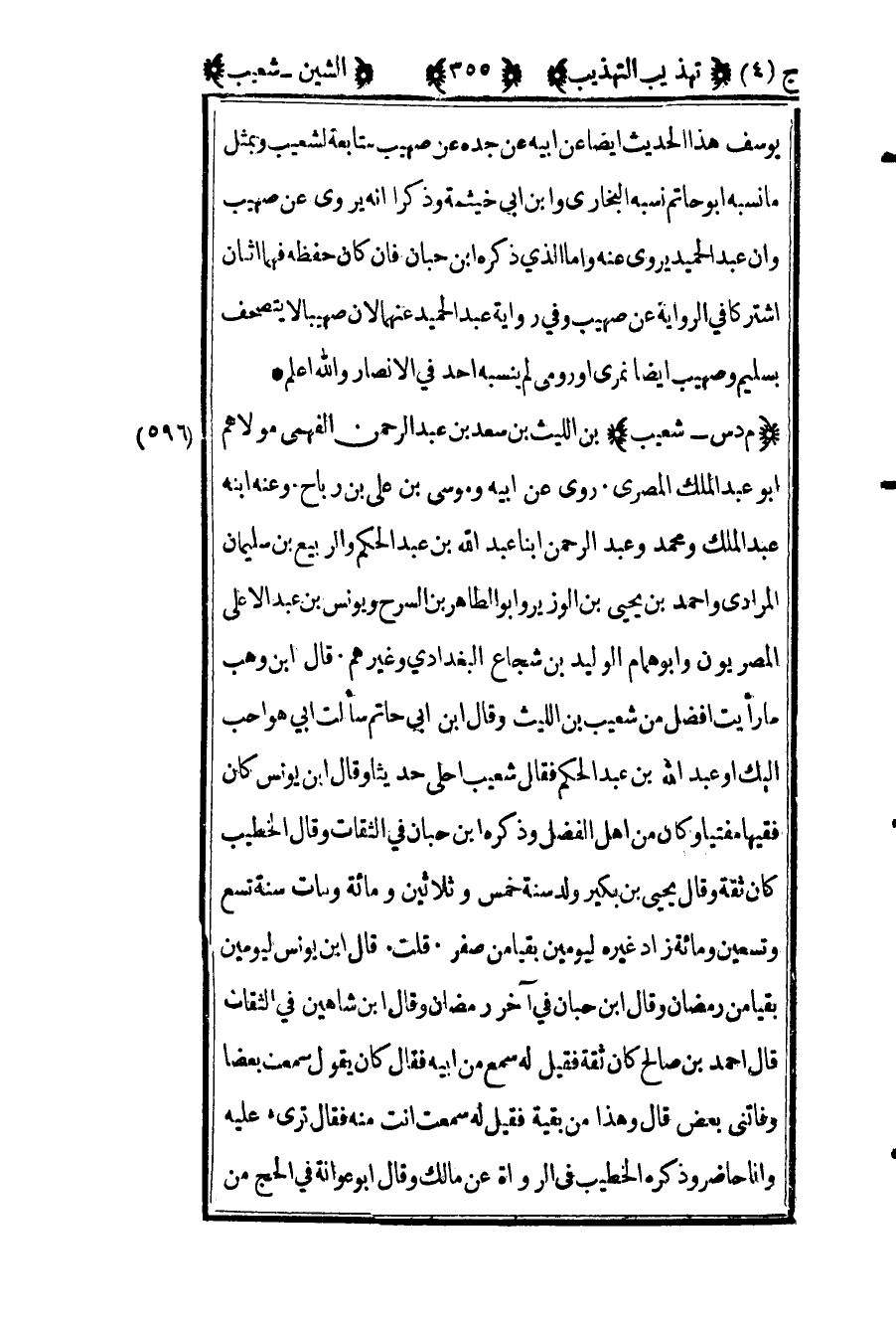 606- "م د س - شعيب" بن الليث بن سعد بن عبد الرحمن الفهمي مولاهم أبو عبد الملك المصري روى عن أبيه وموسى بن علي بن رباح وعنه ابنه عبد الملك ومحمد وعبد الرحمن ابنا عبد الله بن عبد الحكم والربيع بن سليمان المرادي وأحمد بن يحيى بن الوزير وأبو الطاهر بن السرح ويونس بن عبد الأعلى المصريون وأبو همام الوليد بن شجاع البغدادي وغيرهم قال ابن وهب ما رأيت أفضل من شعيب بن الليث وقال ابن أبي حاتم سألت أبي هو أحب إليك أو عبد الله بن عبد الحكم فقال شعيب أحلى حديثا وقال ابن يونس كان فقيها مفيتا وكان من أهل الفضل وذكره ابن حبان في الثقات وقال الخطيب كان ثقة وقال يحيى بن بكير ولد سنة خمس وثلاثين ومائة ومات سنة تسع وتسعين ومائة زاد غيره ليومين بقيا من صفر قلت قال ابن يونس ليومين بقيا من رمضان وقال ابن حبان في آخر رمضان وقال ابن شاهين في الثقات قال أحمد بن صالح كان ثقة فقيل له سمع من أبيه فقال كان يقول سمعت بعضا وفاتني بعض قال وهذا من بقية فقيل له سمعت أنت منه فقال قرئ عليه وأنا حاضر وذكره الخطيب في الرواة عن مالك وقال أبو عوانة في الحج من