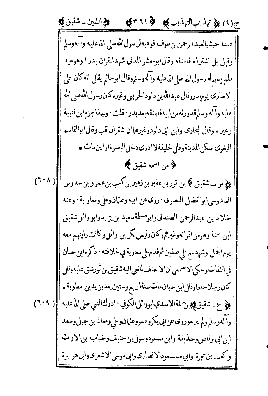 619- "ع - شقيق" بن سلمة الأسدي أبو وائل الكوفي أدرك النبي صلى الله عليه وسلم ولم يره وروى عن أبي بكر وعمر وعثمان وعلي ومعاذ بن جبل وسعد ابن أبي وقاص وحذيفة وابن مسعود وسهل بن حنيف وخباب بن الأرت وكعب بن عجرة وأبي مسعود الأنصاري وأبي موسى الأشعري وأبي هريرة