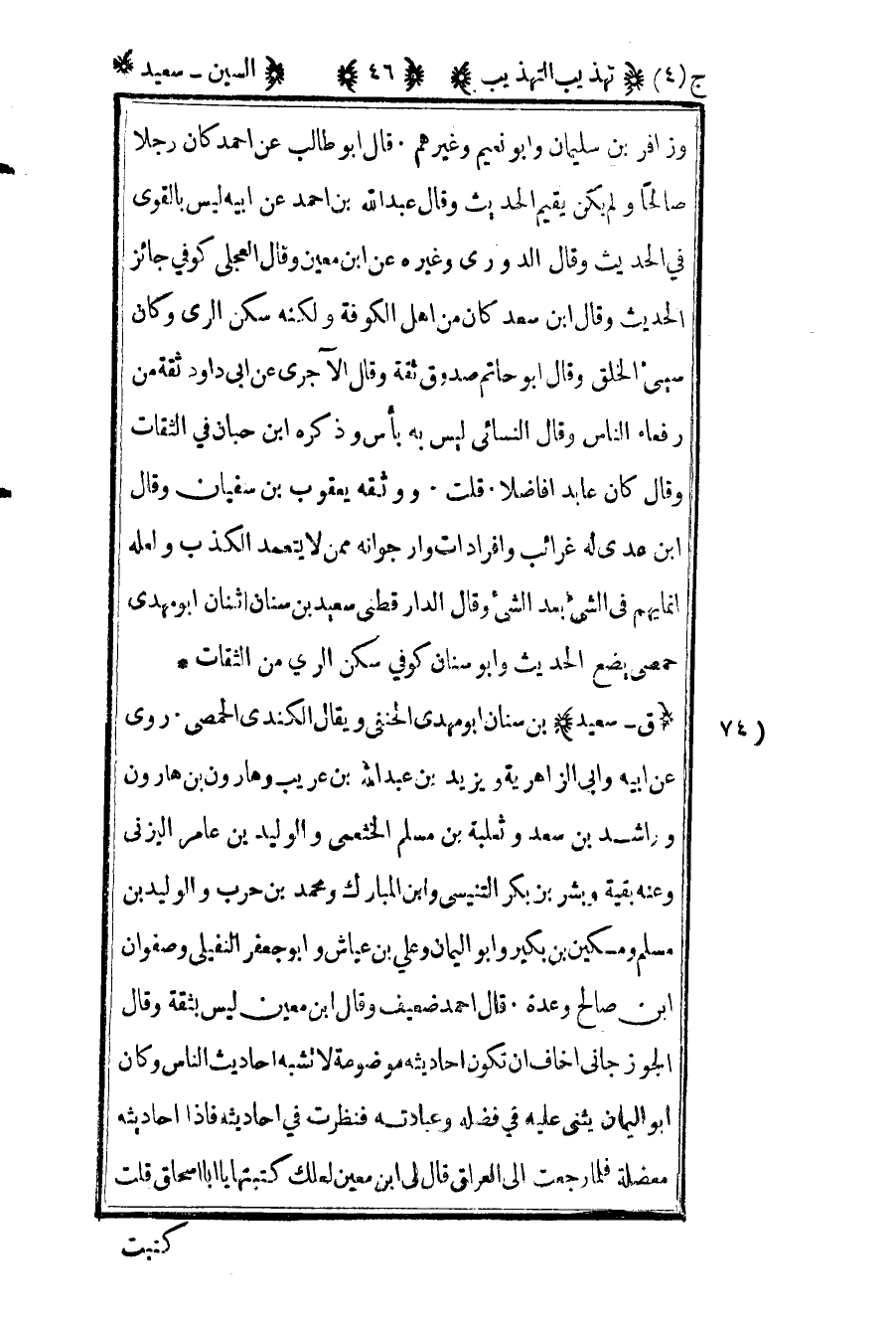 74- "ق- سعيد" بن سنان أبو مهدي الحنفي ويقال الكندي الحمصي روى عن أبيه وأبي الزاهرية ويزيد بن عبد الله بن عريب وهارون بن هارون وراشد بن سعد وثعلبة بن مسلم الخثعمي والوليد بن عامر اليزني وعنه بقية وبشر بن بكر التنيسي وابن المبارك ومحمد بن حرب والوليد بن مسلم ومسكين بن بكير وأبو اليمان وعلي بن عياش وأبو جعفر النفيلي وصفوان بن صالح وعدة قال أحمد ضعيف وقال ابن معين ليس بثقة وقال الجوزجاني أخاف أن تكون أحاديثه موضوعة لا تشبه أحاديث الناس وكان أبو اليمان يثني عليه في فضله وعبادته فنظرت في أحاديثه فإذا أحاديثه معضلة فلما رجعت إلى العراق قال لي ابن معين لعلك كتبتها يا أبا إسحاق قلت