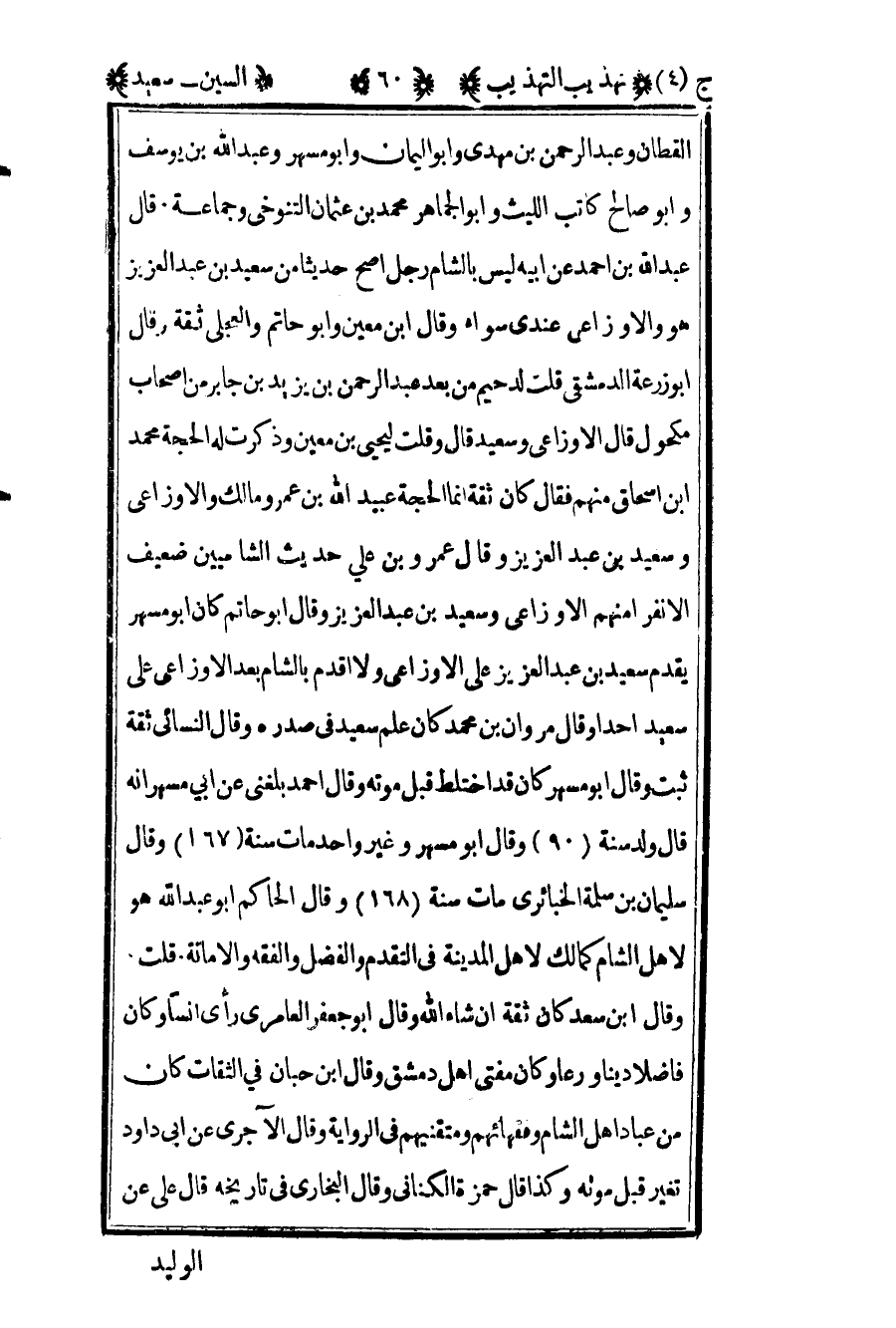 القطان وعبد الرحمن بن مهدي وأبو اليمان وأبو مسهر وعبد الله بن يوسف وأبو صالح كاتب الليث وأبو الجماهر محمد بن عثمان التنوخي وجماعة قال عبد الله بن أحمد عن أبيه ليس بالشام رجل أصح حديثا من سعيد بن عبد العزيز هو الأوزاعي عندي سواء وقال ابن معين وأبو حاتم والعجلي ثقة وقال أبو زرعة الدمشقي قلت لدحيم من بعد عبد الرحمن بن يزيد بن جابر من أصحاب مكحول قال الأوزاعي وسعيد قال وقلت ليحيى بن معين وذكرت الحجة محمد بن إسحاق منهم فقال كان ثقة إنما الحجة عبيد الله بن عمر ومالك والأوزاعي وسعيد بن عبد العزيز وقال عمرو بن علي حديث الشاميين ضعيف إلا نفرا منهم الأوزاعي وسعيد بن عبد العزيز وقال عمرو بن علي حديث الشاميين ضعيف الا نفرا نهم الأوزاعي وسعيد وقال أبو حاتم كان أبو مسهر يقدم سعيد بن عبد العزيز على الأوزاعي ولا أقدم بالشام بعد الأوزاعي على سعيد واحدا وقال مروان بن محمد كان علم سعيد في صدره وقال النسائي ثقة ثبت وقال أبو مسهر كان قد اختلط قبل موته وقال أحمد بلغني عن أبي مسهر أنه قال ولد سنة "90" وقال أبو مسهر وغير واحد مات سنة "167" وقال سليمان بن سلمة الخبائري مات سنة "168" وقال الحاكم أبو عبد الله هو لأهل الشام كمالك لأهل المدينة في التقدم والفضل والفقه والأمانة قلت وقال ابن سعد كان ثقة إن شاء الله وقال أبو جعفر العامري رأى أنسا وكان فاضلا دينا ورعا وكان مفتي أهل دمشق وقال ابن حبان في الثقات كان من عباد أهل الشام وفقهائهم ومتقنيهم في الرواية وقال الآجري عن أبي داود تغير قبل موته وكذا قال حمزة الكناني وقال البخاري في تاريخه قال علي عن