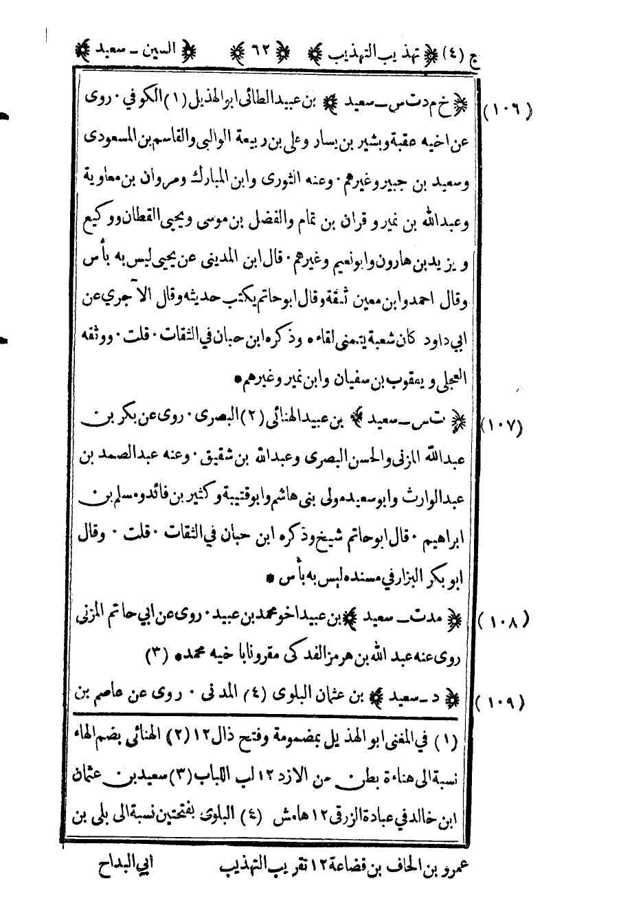 108- "مد ت – سعيد" بن عبيد أخو محمد بن عبيد روى عن أبي حاتم المزني روى عنه عبد الله بن هرمز الفدكي مقرونا بأخيه محمد3.