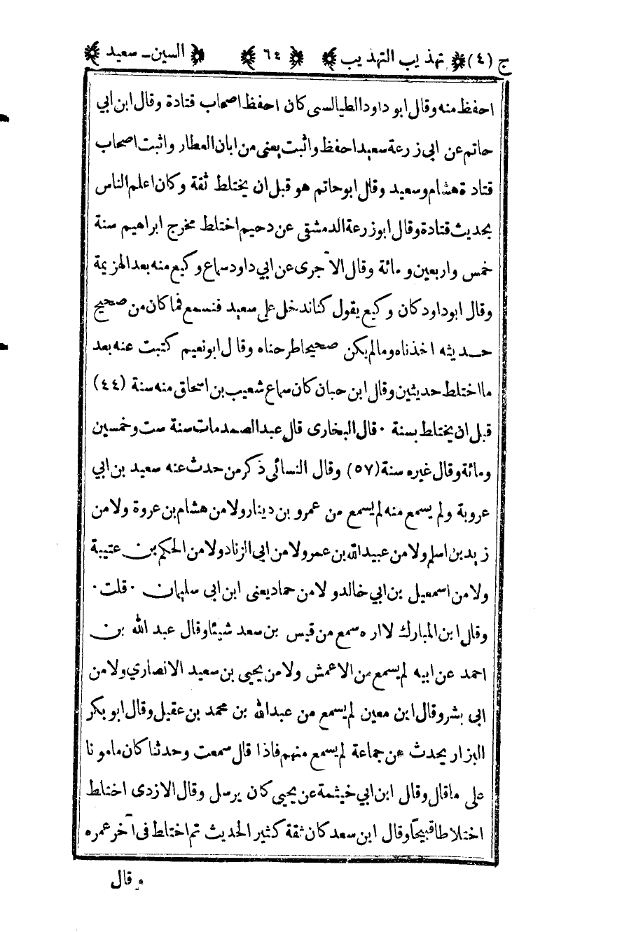 أحفظ منه وقال أبو داود الطيالسي كان أحفظ أصحاب قتادة وقال ابن أبي حاتم عن أبي زرعة سعيد أحفظ وأثبت يعني من أبان العطار وأثبت أصحاب قتادة هشام وسعيد وقال أبو حاتم هو قبل أن يختلط ثقة وكان أعلم الناس بحديث قتادة وقال أبو زرعة الدمشقي عن دحيم اختلط مخرج إبراهيم سنة خمس وأربعين ومائة وقال الآجري عن أبي داود سماع وكيع منه بعد الهزيمة وقال أبو داود كان وكيع يقول كنا ندخل على سعيد فنسمع فما كان من صحيح حديثه أخذناه وما لم يكن صحيحا طرحناه وقال أبو نعيم كتبت عنه بعد ما اختلط حديثين وقال ابن حبان كان سماع شعيب بن إسحاق منه سنة "44" قبل أن يختلط بسنة قال البخاري قال عبد الصمد مات سنة ست وخمسين ومائة وقال غيره سنة "57" وقال النسائي ذكر من حدث عنه سعيد بن أبي عروبة ولم يسمع منه لم يسمع من عمرو بن دينار ولا من هشام بن عروة ولا من زيد بن أسلم ولا من عبيد بن عمر ولا من أبي الزناد ولا من الحكم بن عتيبة ولا من إسماعيل بن أبي خالد ولا من حماد يعني بن أبي سليمان قلت وقال ابن المبارك لا أراه سمع من قيس بن سعد شيئا وقال عبد الله بن أحمد عن أبيه لم يسمع من الأعمش ولا من يحيى بن سعيد الأنصاري ولا من أبي بشر وقال ابن معين لم يسمع من عبد الله بن محمد بن عقيل وقال أبو بكر البزار يحدث عن جماعة لم يسمع منهم فإذا قال سمعت وحدثنا كان مأمونا على ما قال وقال ابن أبي خيثمة عن يحيى كان يرسل وقال الأزدي اختلط اختلاطا قبيحا وقال ابن سعد كان ثقة كثير الحديث ثم اختلط في آخر عمره