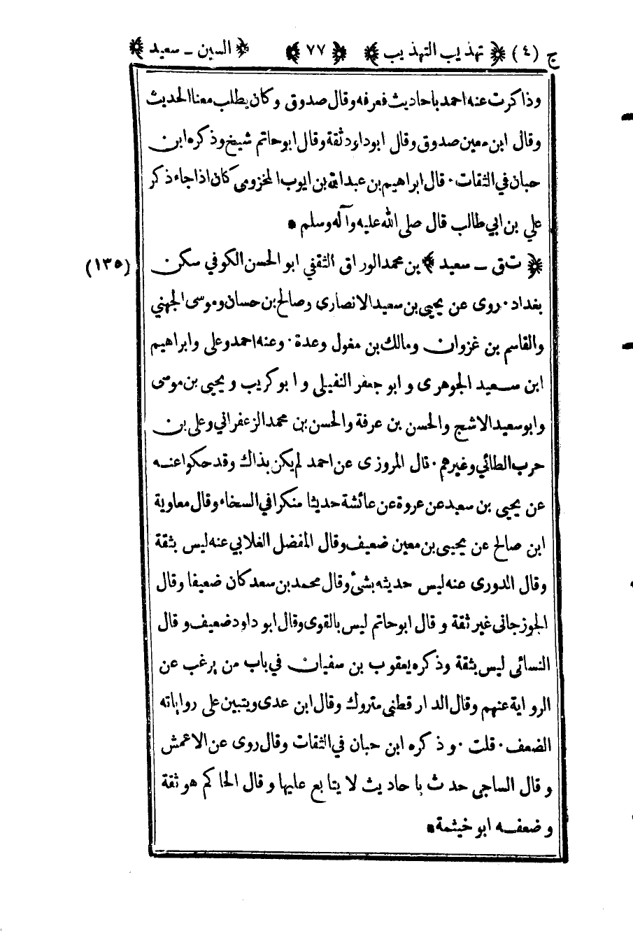 135- "ت ق – سعيد" بن محمد الوراق الثقفي أبو الحسن الكوفي سكن بغداد روى عن يحيى بن سعيد الأنصاري وصالح بن حسان وموسى الجهني والقاسم بن غزوان ومالك بن مغول وعدة وعنه أحمد وعلي وإبراهيم بن سعيد الجوهري وأبو جعفر النفيلي وأبو كريب ويحيى بن موسى وأبو سعيد الأشج والحسن بن عرفة والحسن بن محمد الزعفراني وعلي بن حرب الطائي وغيرهم قال المروزي عن أحمد لم يكن بذاك وقد حكوا عنه عن يحيى بن سعيد عن عروة عن عائشة حديثا منكرا في السخاء وقال معاوية بن صالح عن يحيى بن معين ضعيف وقال المفضل الغلابي عنه ليس بثقة وقال الدوري عنه ليس حديثه بشيء وقال محمد بن سعد كان ضعيفا وقال الجوزجاني غير ثقة وقال أبو حاتم ليس بالقوي وقال أبو داود ضعيف وقال النسائي ليس بثقة وذكره يعقوب بن سفيان في باب من يرغب عن الرواية عنهم وقال الدارقطني متروك وقال ابن عدي ويتبين على رواياته الضعف قلت وذكره ابن حبان في الثقات وقال روى عن الأعمش وقال الساجي حدث بأحاديث لا يتابع عليها وقال الحاكم هو ثقة وضعفه أبو خيثمة.