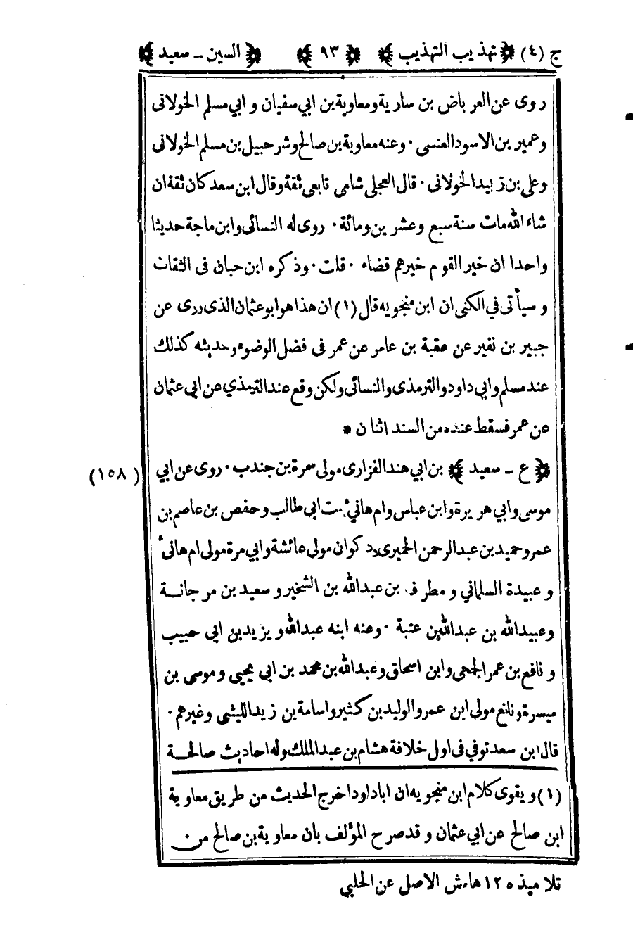 158- "ع – سعيد" بن أبي هند الفزاري مولى سمرة بن جندب روى عن أبي موسى وأبي هريرة وابن عباس وأم هانئ بنت أبي طالب وحفص بن عاصم بن عمر بن حميد بن عبد الرحمن الحميري وذكوان مولى عائشة وأبي مرة مولى أم هانئ وعبيدة السلماني ومطرف بن عبد الله بن الشخير وسعيد بن مرجانة وعبيد الله بن عبد الله بن عتبة وعنه ابنه عبد الله ويزيد بن أبي حبيب ونافع بن عمر الجمحي وابن إسحاق وعبد الله بن محمد بن أبي يحيى وموسى بن ميسرة ونافع مولى بن عمر والوليد بن كثير وأسامة بن زيد الليثي وغيرهم قال ابن سعد توفي في أول خلافة هشام بن عبد الملك وله أحاديث صالحة