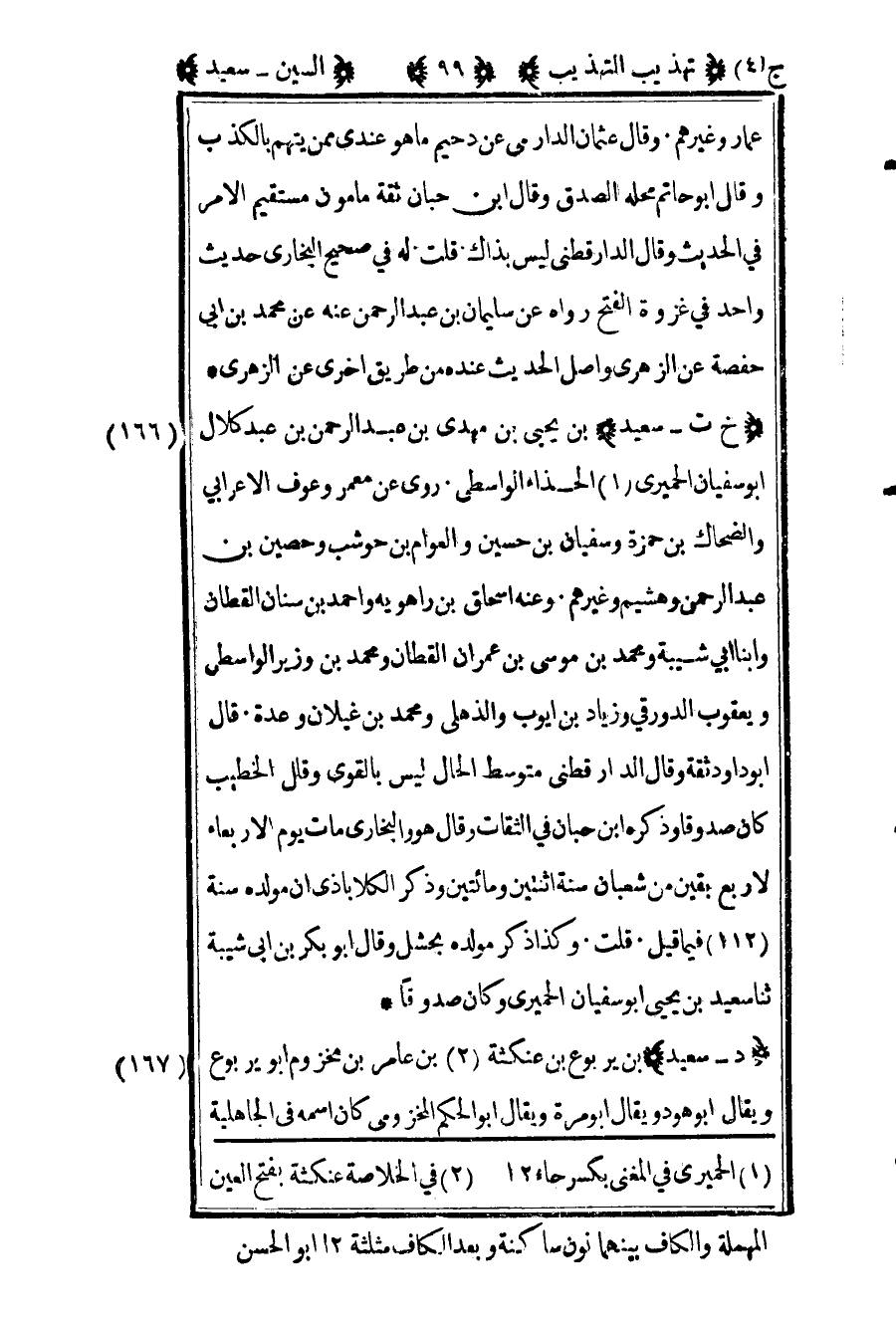 166- "خ ت – سعيد" بن يحيى بن مهدي بن عبد الرحمن بن عبد كلال أبو سفيان الحميري1 الحذاء الواسطي روى عن معمر وعوف الأعرابي والضحاك بن حمزة وسفيان بن حسين والعوام بن حوشب وحصين بن عبد الرحمن وهشيم وغيرهم وعنه إسحاق بن راهويه وأحمد بن سنان القطان وابنا أبي شيبة ومحمد بن موسى بن عمران القطان ومحمد بن وزير الواسطي ويعقوب الدورقي وزياد بن أيوب والذهلي ومحمد بن غيلان وعدة قال أبو داود ثقة وقال الدارقطني متوسط الحال ليس بالقوي وقال الخطيب كان صدوقا وذكره ابن حبان في الثقات وقال هو والبخاري مات يوم الأربعاء لأربع بقين من شعبان سنة اثنتين ومائتين وذكر الكلاباذي أن مولده سنة "112" فيما قيل قلت وكذا ذكر مولده بحشل وقال أبو بكر بن أبي شيبة ثنا سعيد بن يحيى أبو سفيان الحميري وكان صدوقا.