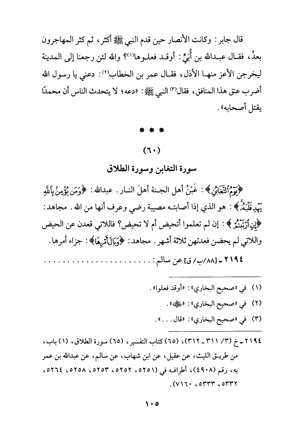2194 - خ (3/ 311 - 312)، (65) كتاب التفسير، (65) سورة الطلاق، (1) باب، من طريق الليث، عن عقيل، عن ابن شهاب، عن سالم، عن عبد اللَّه بن عمر به، رقم (4908)، أطرافه في (5251، 5252، 5253، 5258، 5264، 5332، 5333، 7160).