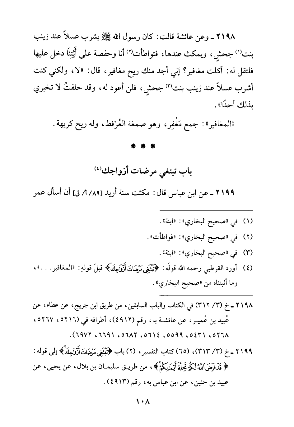 (¬4) أورد القرطبي رحمه اللَّه قولَه: {تَبْتَغِي مَرْضَاتَ أَزْوَاجِكَ} قبلَ قولهِ: "المغافير. . . "، وما أثبتناه من "صحيح البخاري".