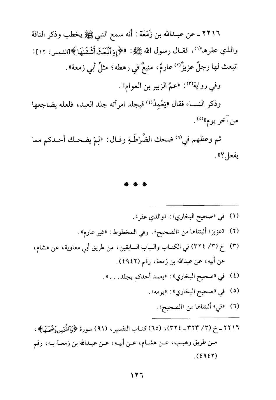 2216 - خ (3/ 323 - 324)، (65) كتاب التفسير، (91) سورة {وَالشَّمْسِ وَضُحَاهَا}، من طريق وهيب، عن هشام، عن أبيه، عن عبد اللَّه بن زمعة به، رقم (4942).