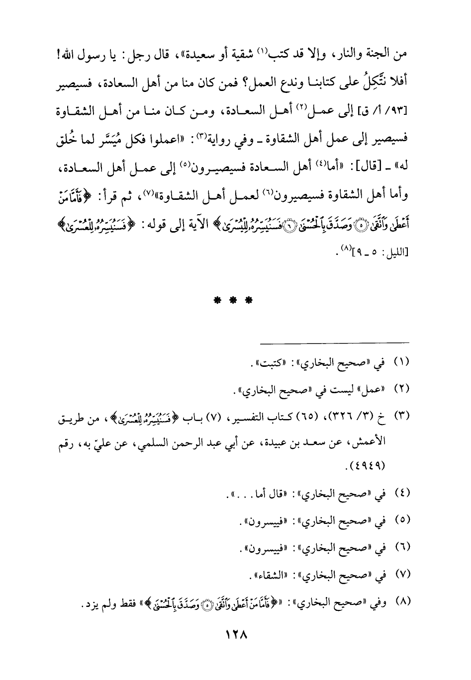 (¬3) خ (3/ 326)، (65) كتاب التفسير، (7) باب {فَسَنُيَسِّرُهُ لِلْعُسْرَى}، من طريق الأعمش، عن سعد بن عبيدة، عن أبي عبد الرحمن السلمي، عن عليّ به، رقم (4949).