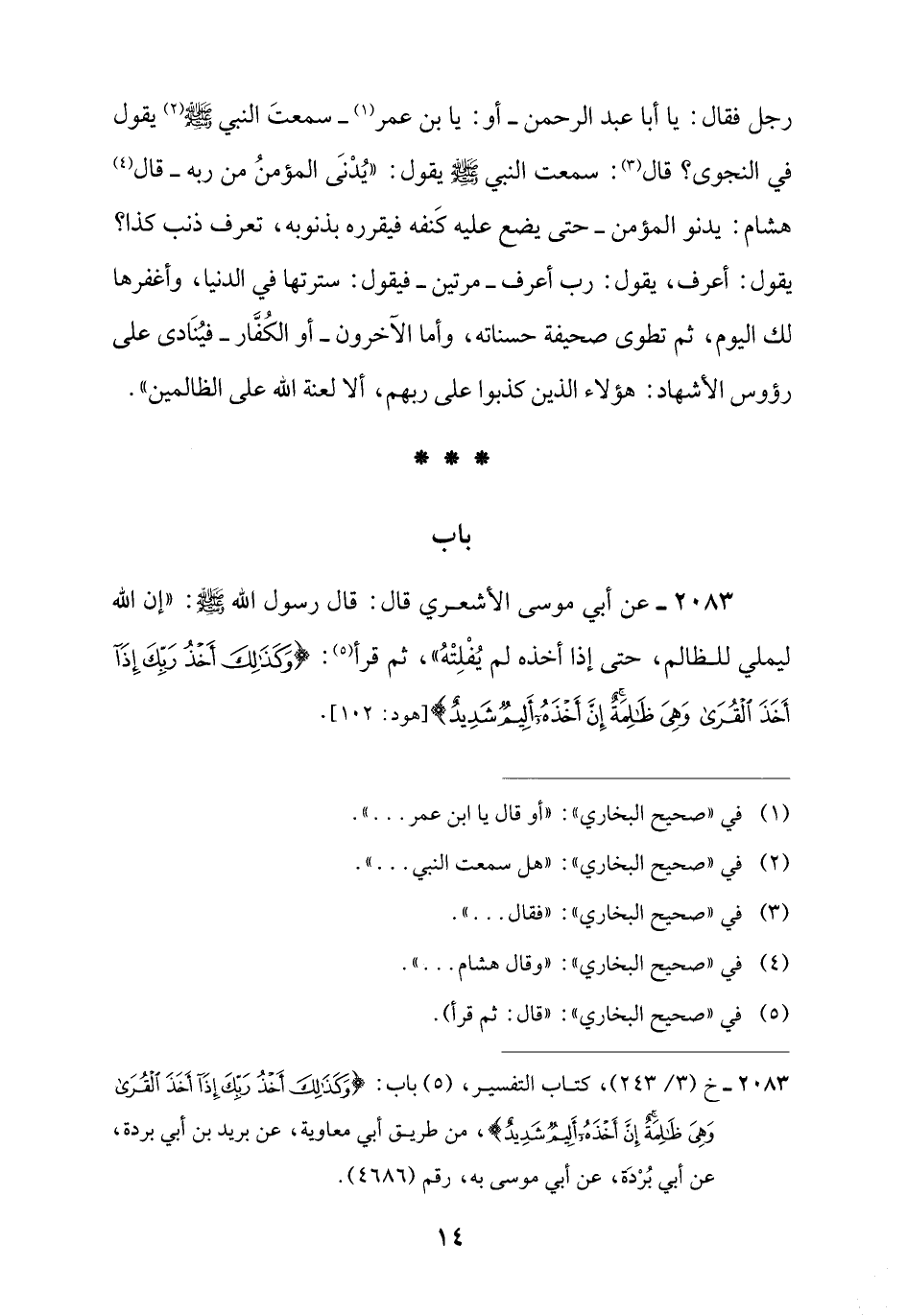 2083 - عن أبي موسى الأشعري قال: قال رسول اللَّه -صلى اللَّه عليه وسلم-: "إن اللَّه ليملي للظالم، حتى إذا أخذه لم يُفْلِتْهُ"، ثم قرأ (¬5): {وَكَذَلِكَ أَخْذُ رَبِّكَ إِذَا أَخَذَ الْقُرَى وَهِيَ ظَالِمَةٌ إِنَّ أَخْذَهُ أَلِيمٌ شَدِيدٌ} [هود: 102].