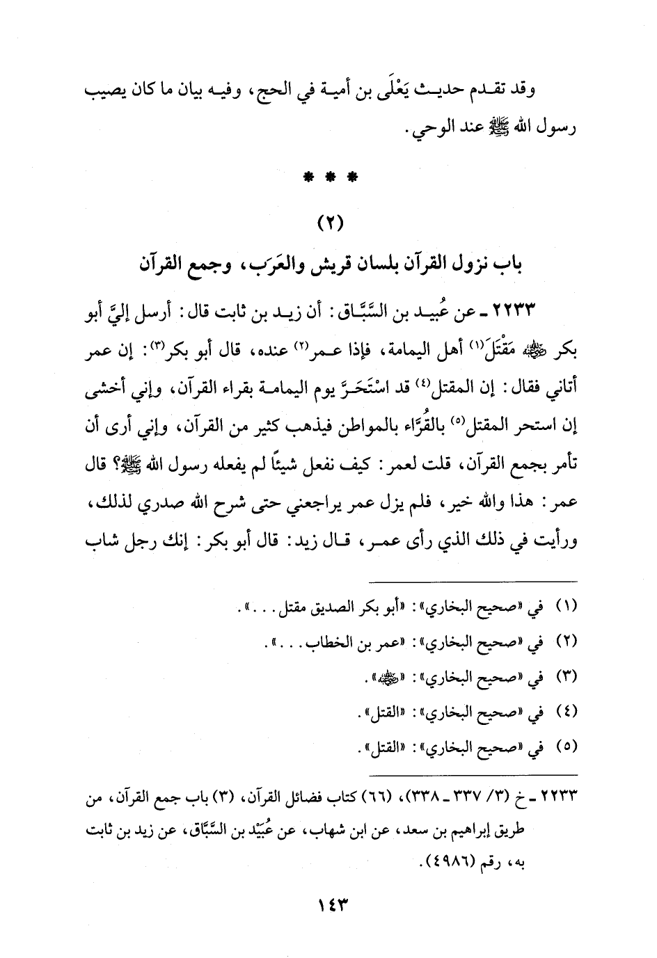 2233 - خ (3/ 337 - 338)، (66) كتاب فضائل القرآن، (3) باب جمع القرآن، من طريق إبراهيم بن سعد، عن ابن شهاب، عن عُبَيْد بن السَّبَّاق، عن زيد بن ثابت به، رقم (4986).