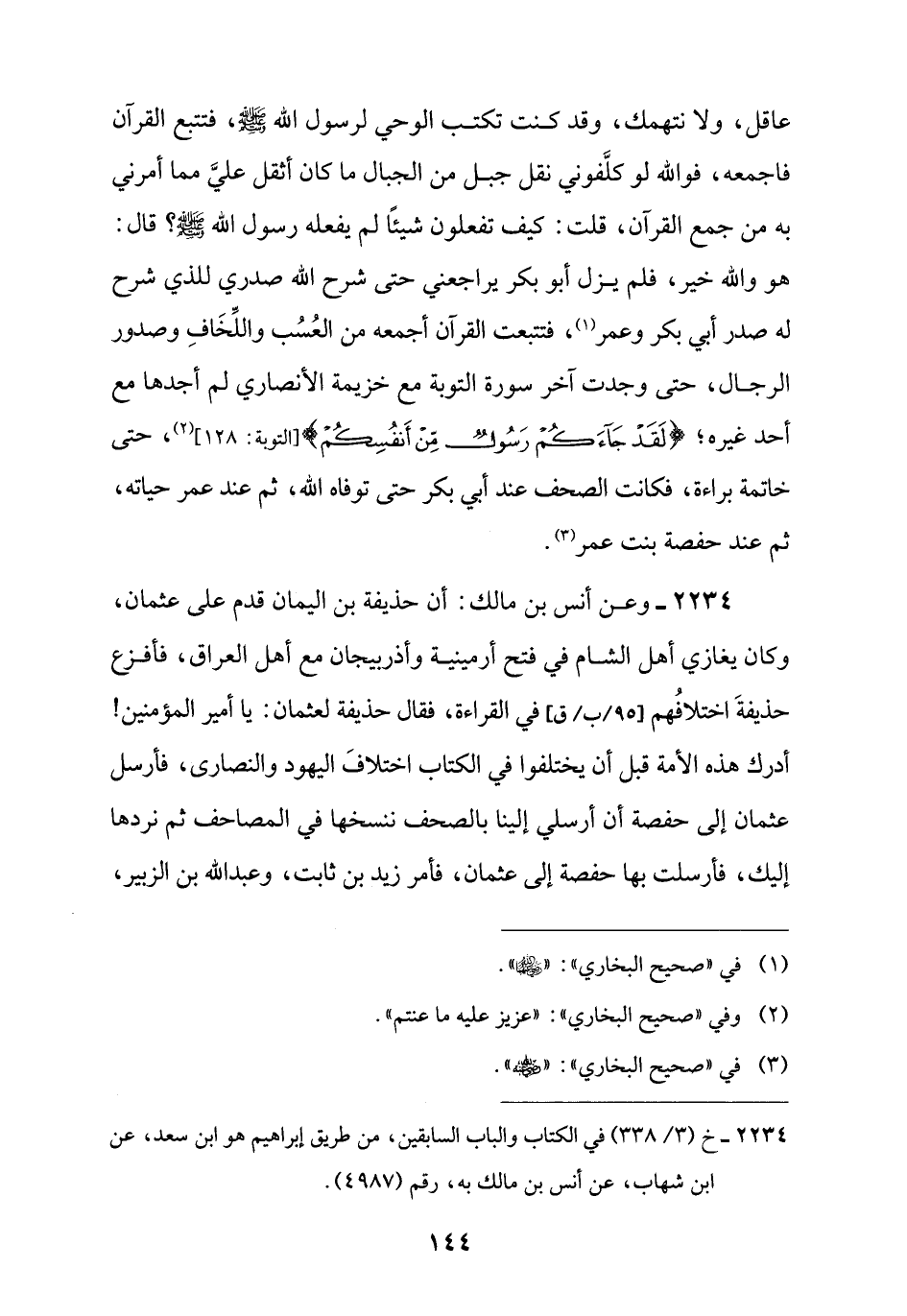 2234 - وعن أنس بن مالك: أن حذيفة بن اليمان قدم على عثمان، وكان يغازي أهل الشام في فتح أرمينية وأذربيجان مع أهل العراق، فأفزع حذيفةَ اختلافُهم في القراءة، فقال حذيفة لعثمان: يا أمير المؤمنين! أدرك هذه الأمة قبل أن يختلفوا في الكتاب اختلافَ اليهود والنصارى، فأرسل عثمان إلى حفصة أن أرسلي إلينا بالصحف ننسخها في المصاحف ثم نردها إليك، فأرسلت بها حفصة إلى عثمان، فأمر زيد بن ثابت، وعبد اللَّه بن الزبير،