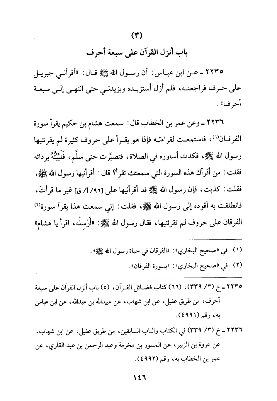 2235 - خ (3/ 339)، (66) كتاب فضائل القرآن، (5) باب أنزل القرآن على سبعة أحرف، من طريق عقيل، عن ابن شهاب، عن عبيد اللَّه بن عبد اللَّه، عن ابن عباس به، رقم (4991).