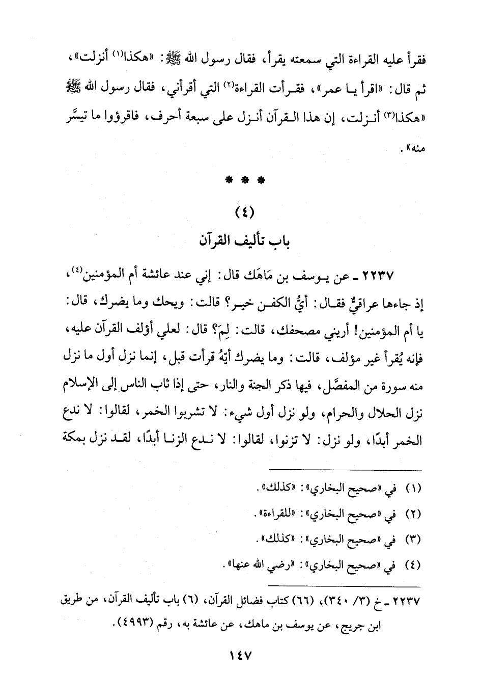 2237 - خ (3/ 340)، (66) كتاب فضائل القرآن، (6) باب تأليف القرآن، من طريق ابن جريج، عن يوسف بن ماهك، عن عائشة به، رقم (4993).