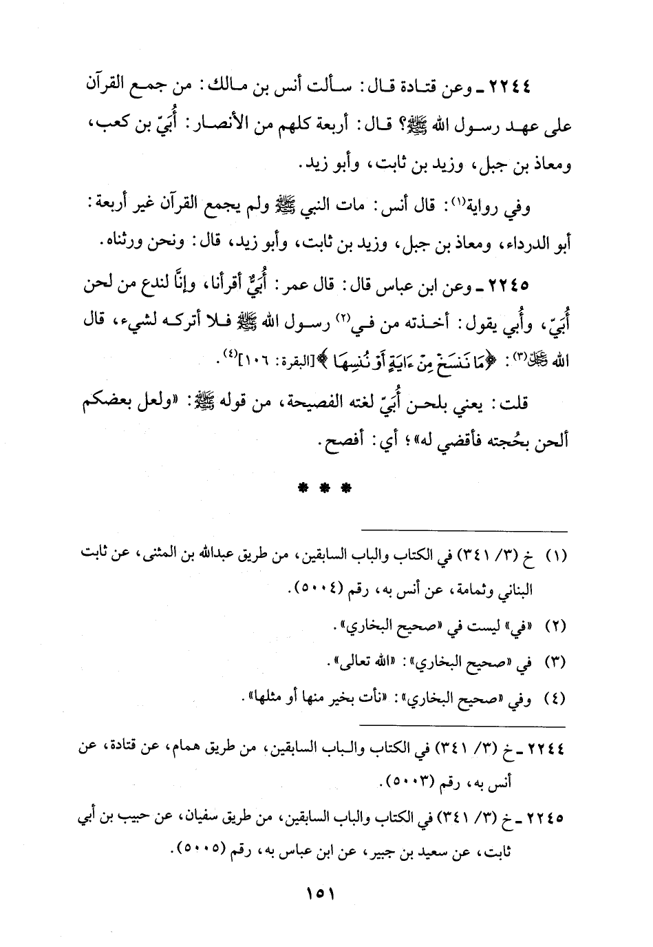2244 - وعن قتادة قال: سألت أنس بن مالك: من جمع القرآن على عهد رسول اللَّه -صلى اللَّه عليه وسلم-؟ قال: أربعة كلهم من الأنصار: أُبَيّ بن كعب، ومعاذ بن جبل، وزيد بن ثابت، وأبو زيد.