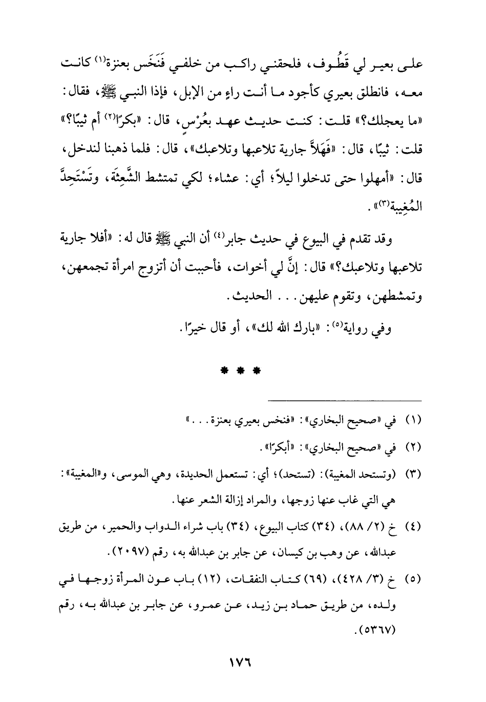 على بعير لي قَطُوف، فلحقني راكب من خلفي فَنَخَس بعنزة (¬1) كانت معه، فانطلق بعيري كأجود ما أنت راءٍ من الإبل، فإذا النبي -صلى اللَّه عليه وسلم-، فقال: "ما يعجلك؟ " قلت: كنت حديث عهد بعُرْسٍ، قال: "بكرًا (¬2) أم ثيبًا؟ " قلت: ثيبًا، قال: "فَهَلَّا جارية تلاعبها وتلاعبك"، قال: فلما ذهبنا لندخل، قال: "أمهلوا حتى تدخلوا ليلًا؛ أي: عشاء؛ لكي تمتشط الشَّعِثَة، وتَسْتَحِدَّ المُغِيبة (¬3) ".