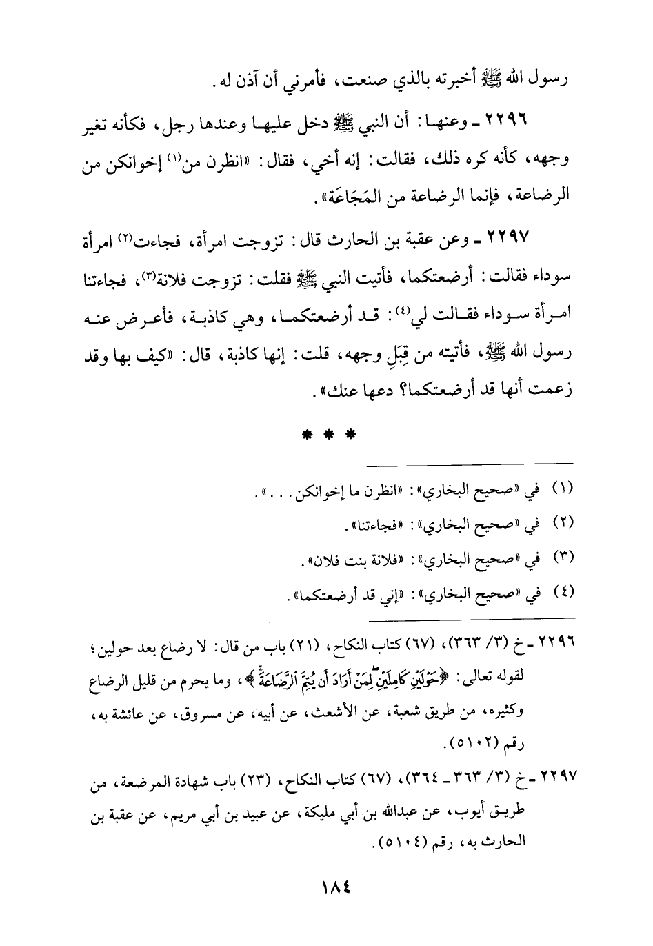 2297 - وعن عقبة بن الحارث قال: تزوجت امرأة، فجاءت (¬2) امرأة سوداء فقالت: أرضعتكما، فأتيت النبي -صلى اللَّه عليه وسلم- فقلت: تزوجت فلانة (¬3)، فجاءتنا امرأة سوداء فقالت لي (¬4): قد أرضعتكما، وهي كاذبة، فأعرض عنه رسول اللَّه -صلى اللَّه عليه وسلم-، فأتيته من قِبَلِ وجهه، قلت: إنها كاذبة، قال: "كيف بها وقد زعمت أنها قد أرضعتكما؟ دعها عنك".
