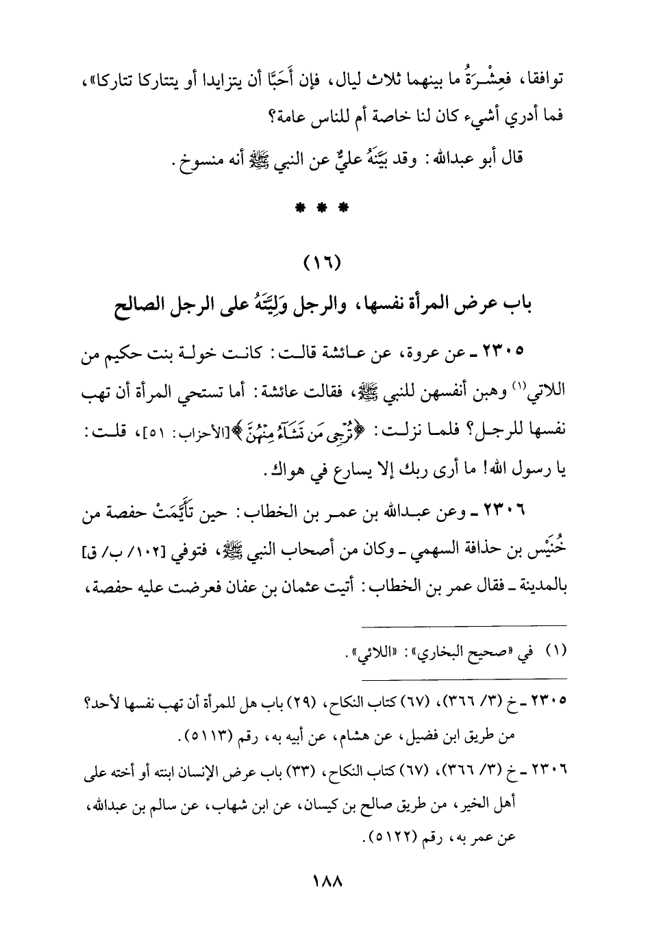 2306 - وعن عبد اللَّه بن عمر بن الخطاب: حين يَأَّيَّمَتْ حفصة من خُنَيْس بن حذافة السهمي -وكان من أصحاب النبي -صلى اللَّه عليه وسلم-، فتوفي بالمدينة- فقال عمر بن الخطاب: أتيت عثمان بن عفان فعرضت عليه حفصة،