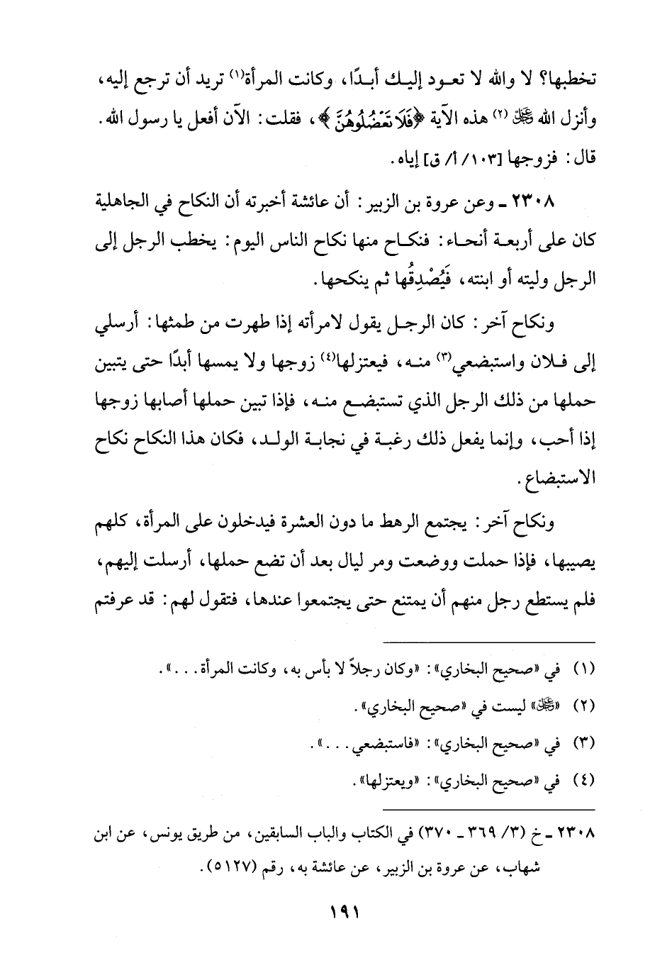 2308 - وعن عروة بن الزبير: أن عائشة أخبرته أن النكاح في الجاهلية كان على أربعة أنحاء: فنكاح منها نكاح الناس اليوم: يخطب الرجل إلى الرجل وليته أو ابنته، فَيُصْدِقُها ثم ينكحها.