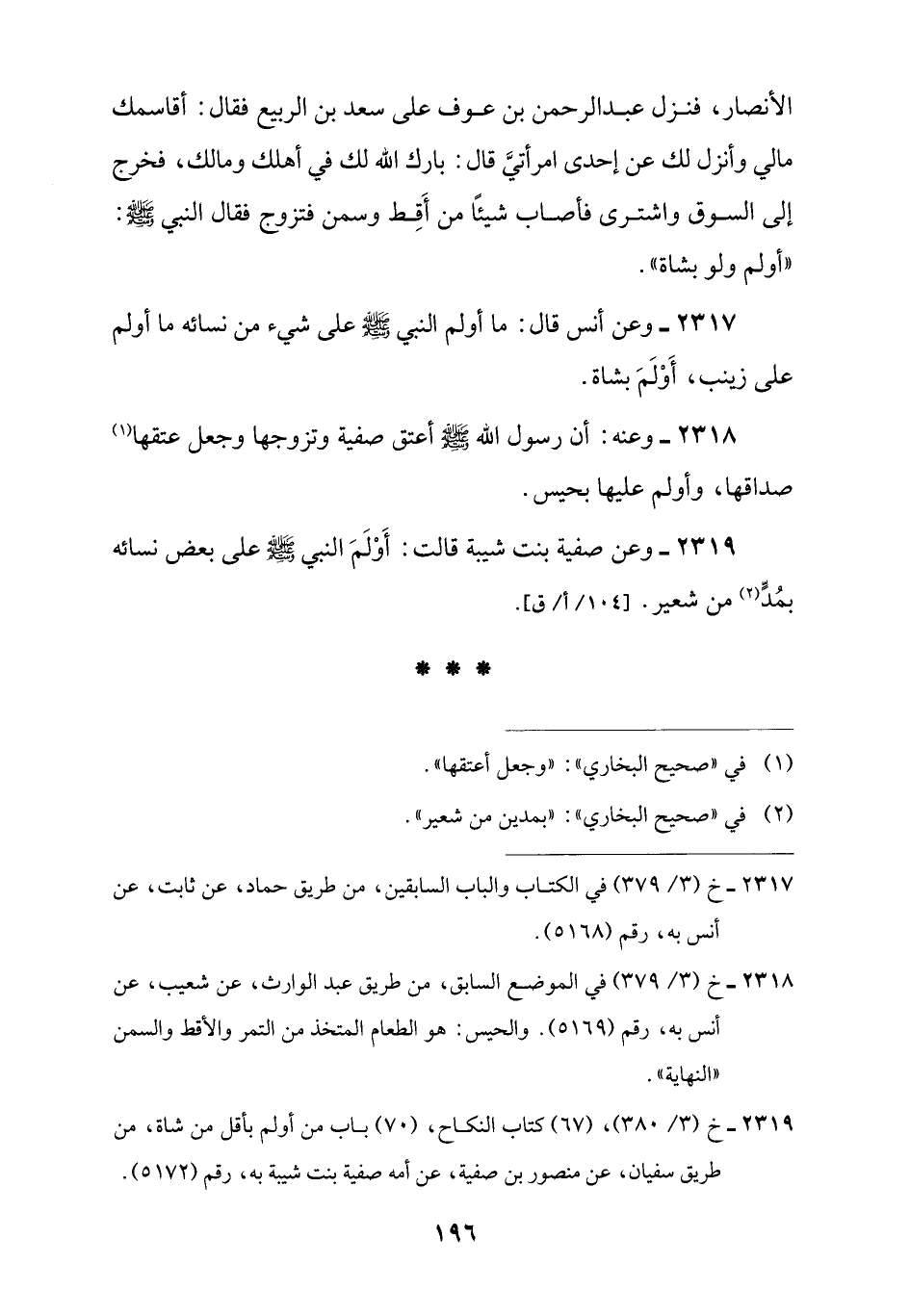 2319 - وعن صفية بنت شيبة قالت: أَوْلَمَ النبي -صلى اللَّه عليه وسلم- على بعض نسائه بمُدٍّ (¬2) من شعير.