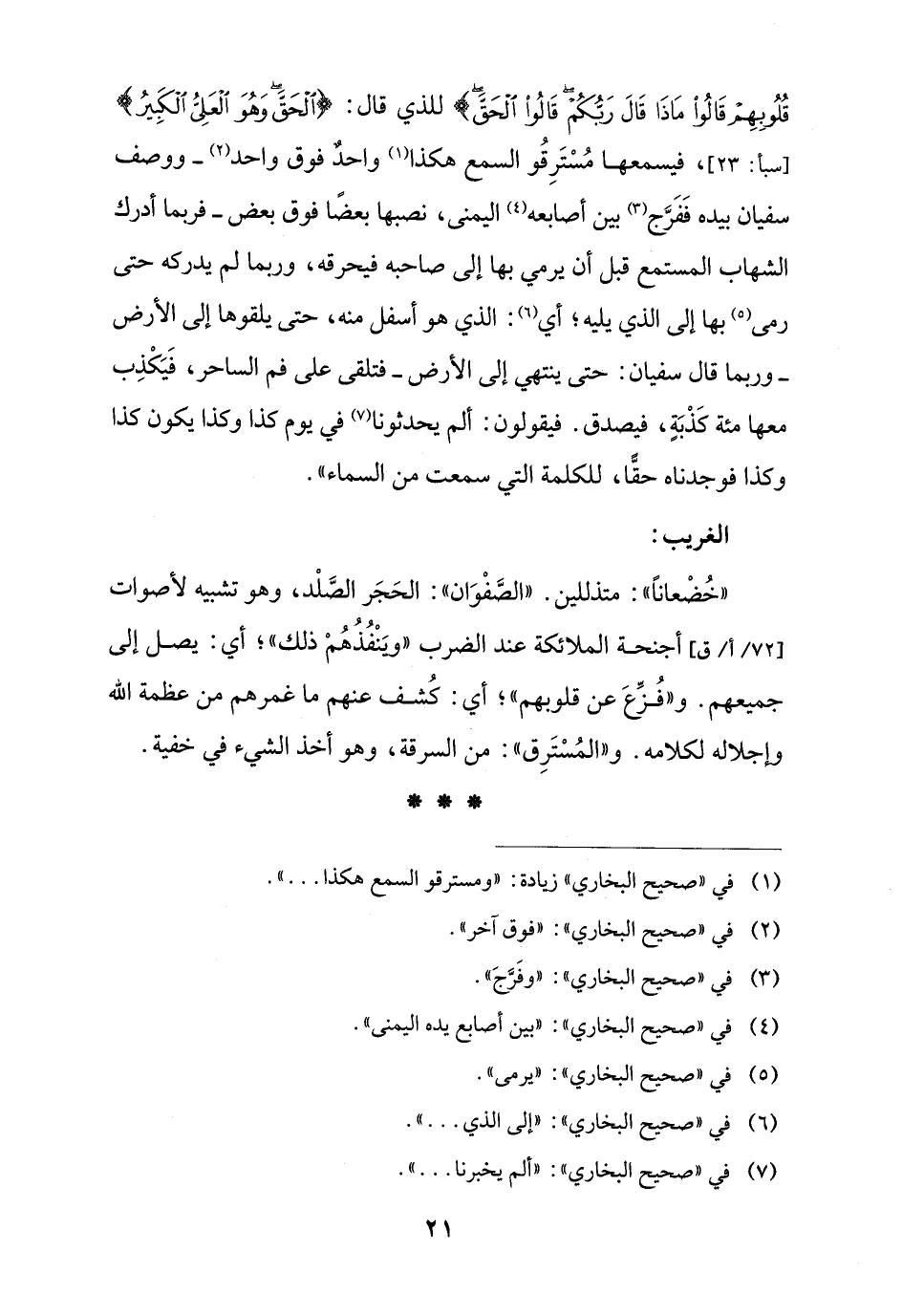 "خُضْعانًا": متذللين. "الصَّفْوَان": الحَجَر الصَّلْد، وهو تشبيه لأصوات أجنحة الملائكة عند الضرب "وَينْفُذُهُمْ ذلك"؛ أي: يصل إلى جميعهم. و"فُزِّعَ عن قلوبهم"؛ أي: كُشف عنهم ما غمرهم من عظمة اللَّه وإجلاله لكلامه. و"المُسْتَرِق": من السرقة، وهو أخذ الشيء في خفية.
