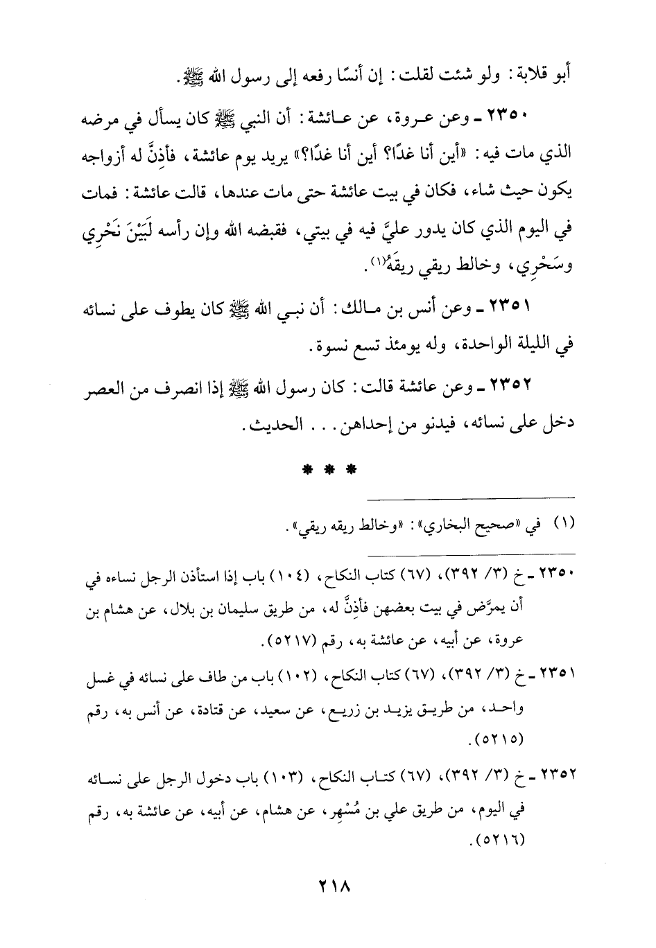2352 - وعن عائشة قالت: كان رسول اللَّه -صلى اللَّه عليه وسلم- إذا انصرف من العصر دخل على نسائه، فيدنو من إحداهن. . . الحديث.