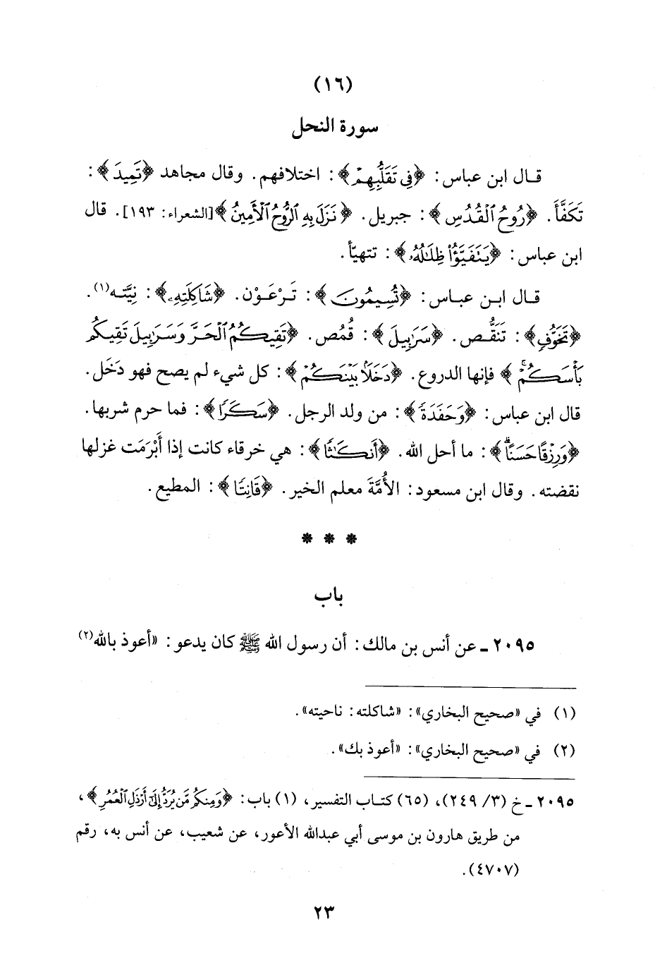 قال ابن عباس: {تُسِيمُونَ}: تَرْعَوْن. {شَاكِلَتِهِ}: نِيَّته (¬1). {تَخَوُّفٍ}: تَنَقُّص. {سَرَابِيلَ}: قُمُص. {تَقِيكُمُ الْحَرَّ وَسَرَابِيلَ تَقِيكُمْ بَأْسَكُمْ} فإنها الدروع. {دَخَلًا بَيْنَكُمْ}: كل شيء لم يصح فهو دَخَل. قال ابن عباس: {وَحَفَدَةً}: من ولد الرجل. {سَكَرًا}: فما حرم شربها. {وَرِزْقًا حَسَنًا}: ما أحل اللَّه. {أَنْكَاثًا}: هي خرقاء كانت إذا أَبْرَمَت غزلها نقضته. وقال ابن مسعود: الأُمَّةَ معلم الخير. {قَانِتًا}: المطيع.