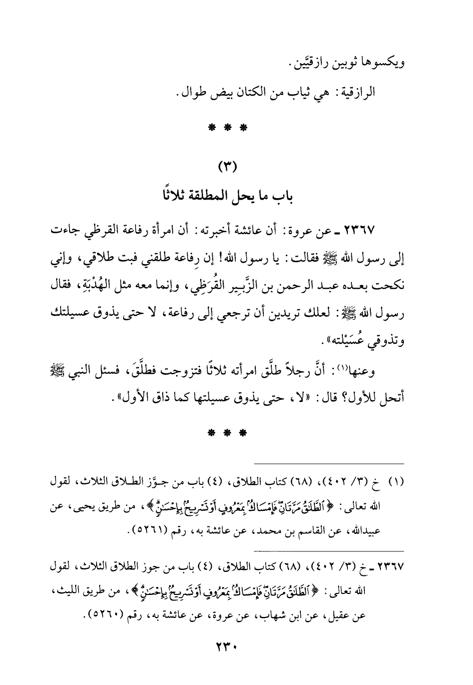 (¬1) خ (3/ 402)، (68) كتاب الطلاق، (4) باب من جوَّز الطلاق الثلاث، لقول اللَّه تعالى: {الطَّلَاقُ مَرَّتَانِ فَإِمْسَاكٌ بِمَعْرُوفٍ أَوْ تَسْرِيحٌ بِإِحْسَانٍ}، من طريق يحيى، عن عبيد اللَّه، عن القاسم بن محمد، عن عائشة به، رقم (5261).