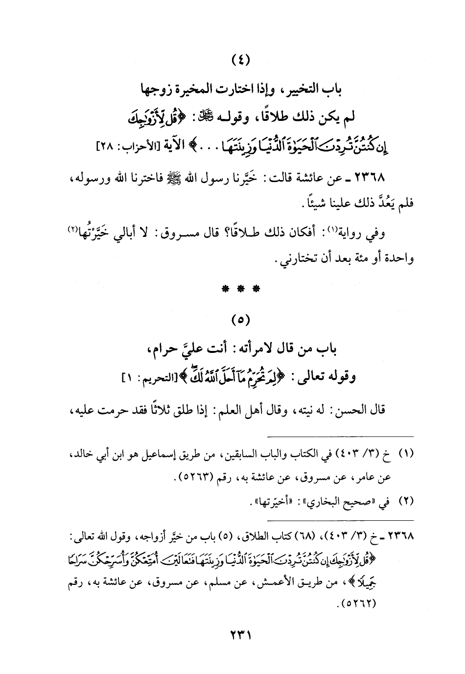 (4) باب التخيير، وإذا اختارت المخيرة زوجها لم يكن ذلك طلاقًا، وقوله عز وجل: {قُلْ لِأَزْوَاجِكَ إِنْ كُنْتُنَّ تُرِدْنَ الْحَيَاةَ الدُّنْيَا وَزِينَتَهَا. . .} الآية [الأحزاب: 28]