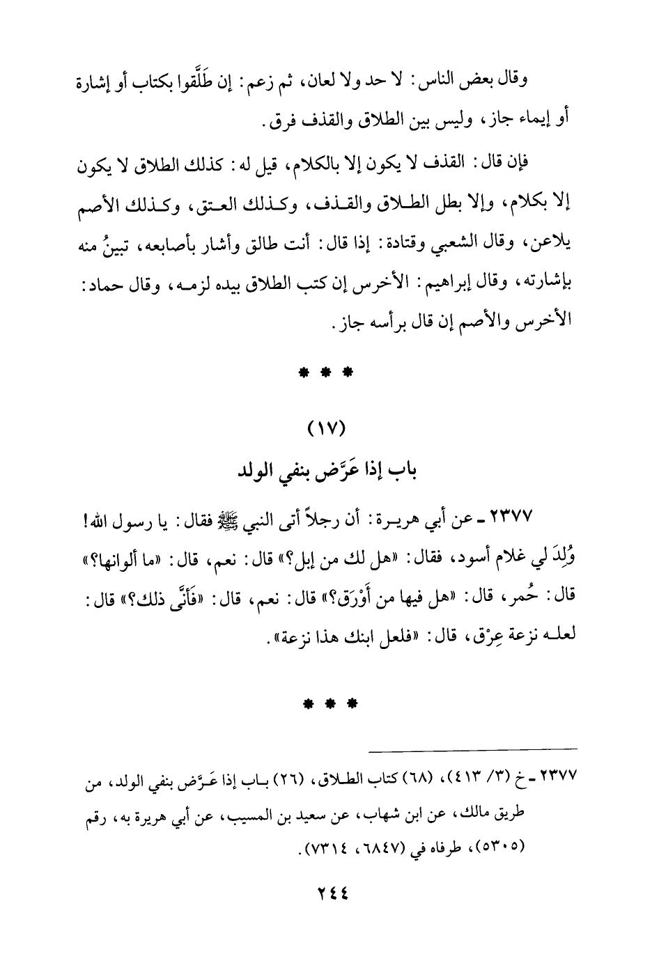 2377 - خ (3/ 413)، (68) كتاب الطلاق، (26) باب إذا عَرَّض بنفي الولد، من طريق مالك، عن ابن شهاب، عن سعيد بن المسيب، عن أبي هريرة به، رقم (5305)، طرفاه في (6847، 7314).