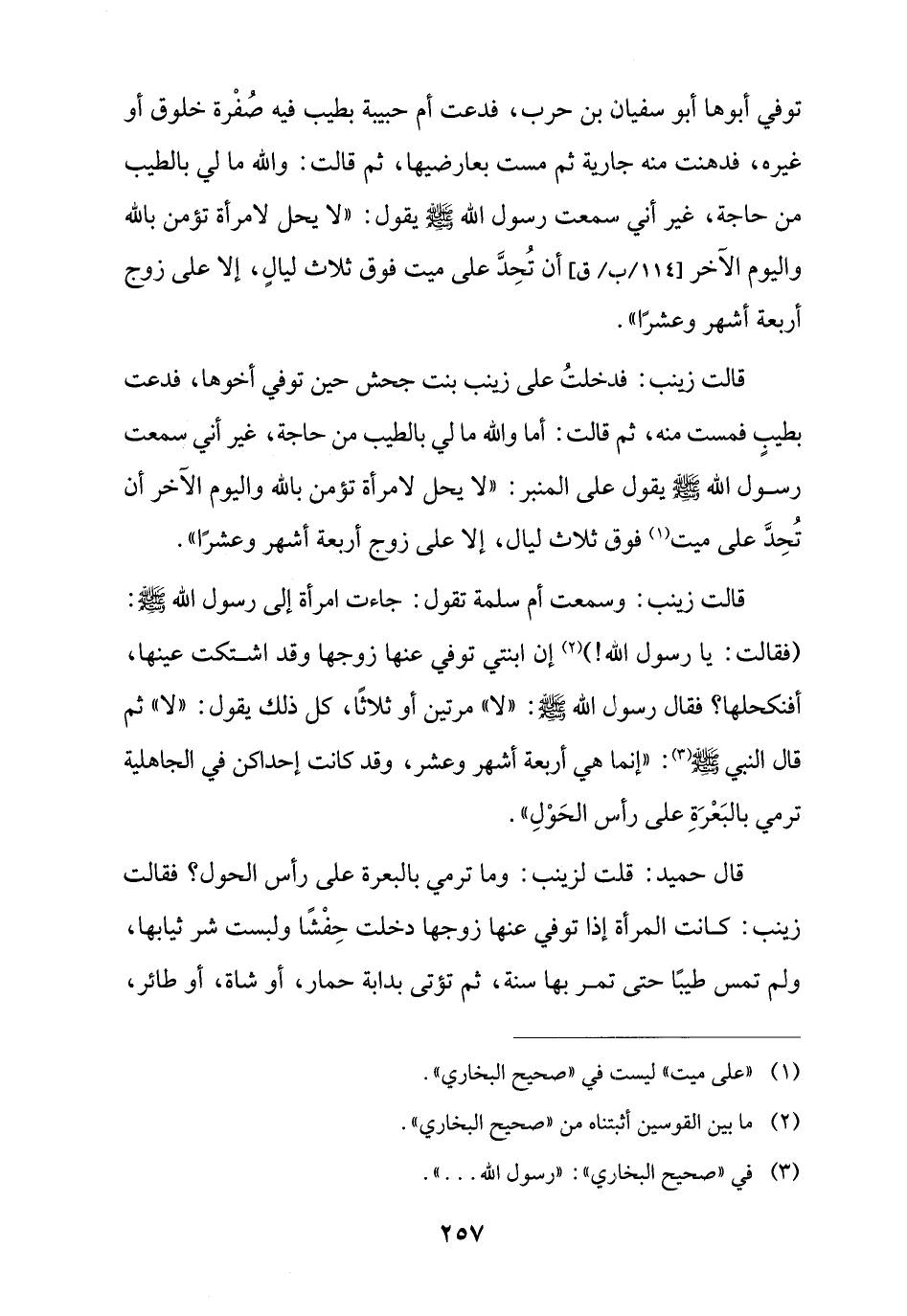 قالت زينب: وسمعت أم سلمة تقول: جاءت امرأة إلى رسول اللَّه -صلى اللَّه عليه وسلم-: (فقالت: يا رسول اللَّه! ) (¬2) إن ابنتي توفي عنها زوجها وقد اشتكت عينها، أفنكحلها؟ فقال رسول اللَّه -صلى اللَّه عليه وسلم-: "لا" مرتين أو ثلاثًا، كل ذلك يقول: "لا" ثم قال النبي -صلى اللَّه عليه وسلم- (¬3): "إنما هي أربعة أشهر وعشر، وقد كانت إحداكن في الجاهلية ترمي بالبَعْرَةِ على رأس الحَوْلِ".