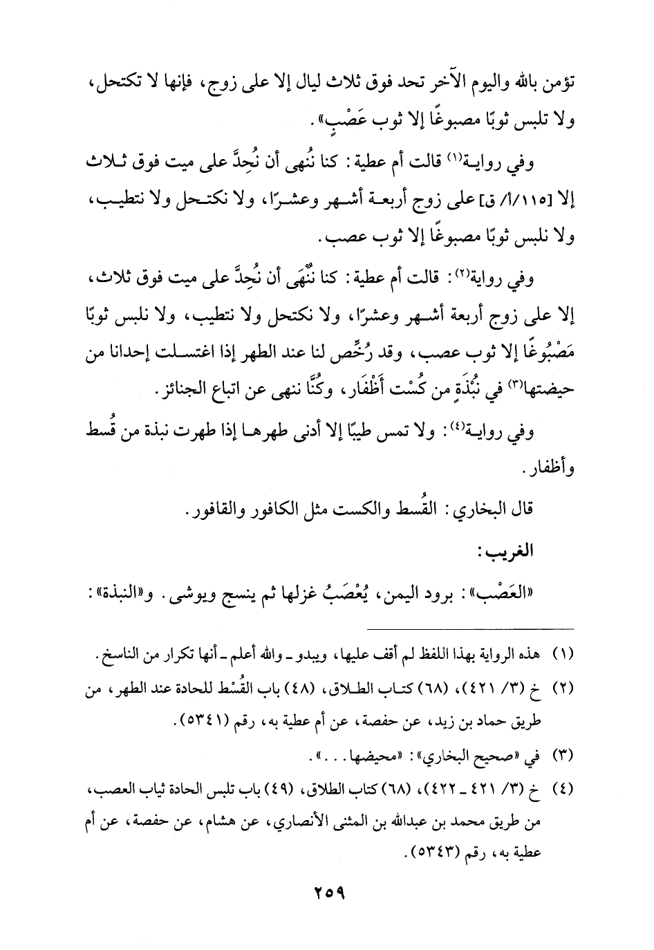 (¬4) خ (3/ 421 - 432)، (68) كتاب الطلاق، (49) باب تلبس الحادة ثياب العصب، من طريق محمد بن عبد اللَّه بن المثنى الأنصاري، عن هشام، عن حفصة، عن أم عطية به، رقم (5343).