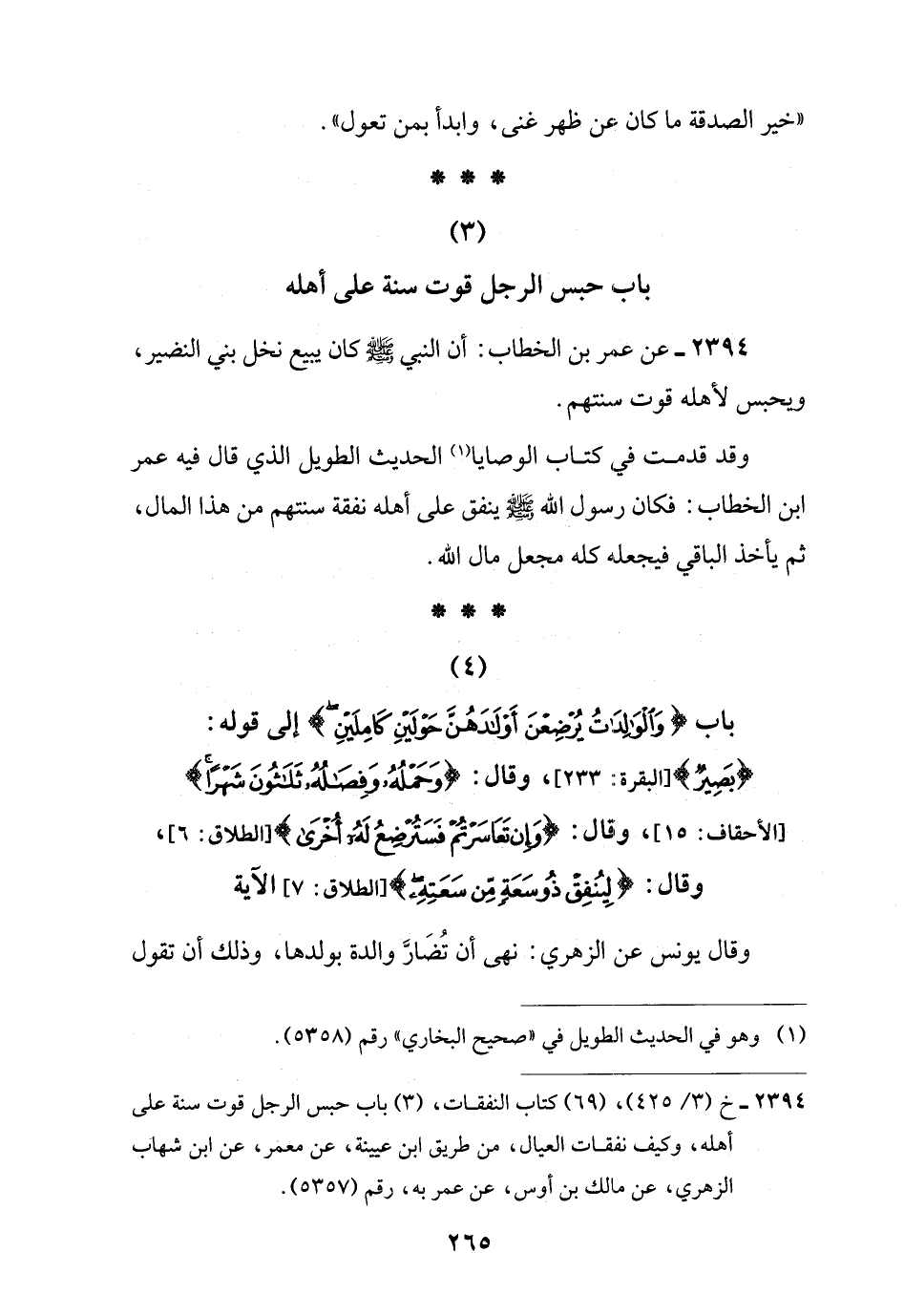 2394 - خ (3/ 425)، (69) كتاب النفقات، (3) باب حبس الرجل قوت سنة على أهله، وكيف نفقات العيال، من طريق ابن عيينة، عن معمر، عن ابن شهاب الزهري، عن مالك بن أوس، عن عمر به، رقم (5357).