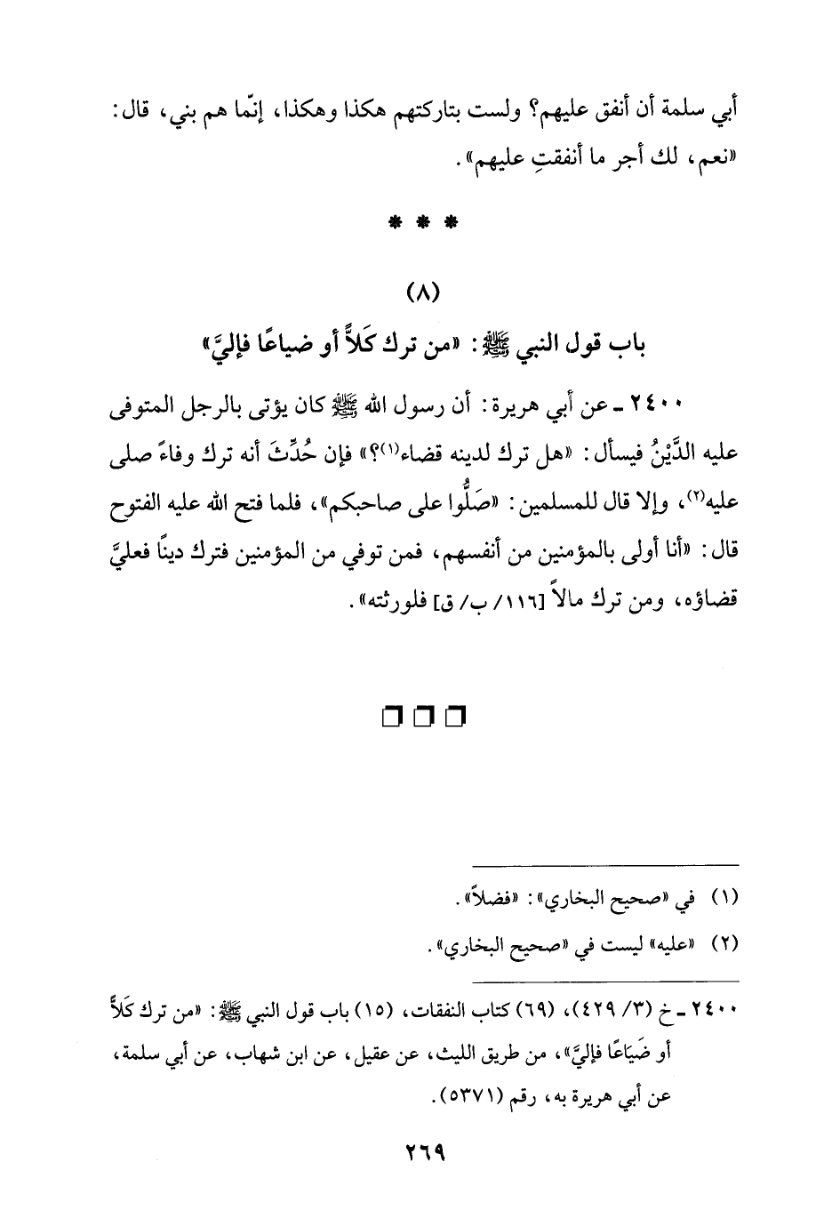 2400 - خ (3/ 429)، (69) كتاب النفقات، (15) باب قول النبي -صلى اللَّه عليه وسلم-: "من ترك كَلًّا أو ضَيَاعًا فإليَّ"، من طريق الليث، عن عقيل، عن ابن شهاب، عن أبي سلمة، عن أبي هريرة به، رقم (5371).
