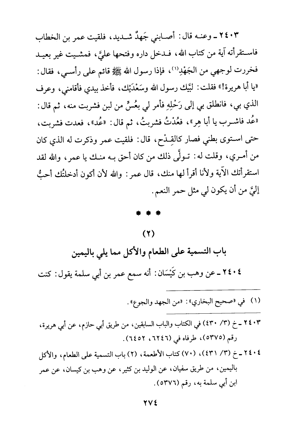 2404 - خ (3/ 431)، (70) كتاب الأطعمة، (2) باب التسمية على الطعام، والأكل باليمين، من طريق سفيان، عن الوليد بن كثير، عن وهب بن كيسان، عن عمر ابن أبي سلمة به، رقم (5376).