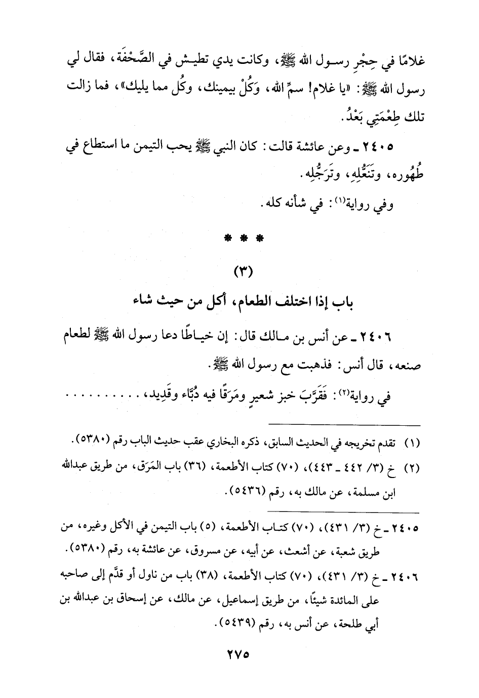 2405 - خ (3/ 431)، (70) كتاب الأطعمة، (5) باب التيمن في الأكل وغيره، من طريق شعبة، عن أشعث، عن أبيه، عن مسروق، عن عائشة به، رقم (5380).